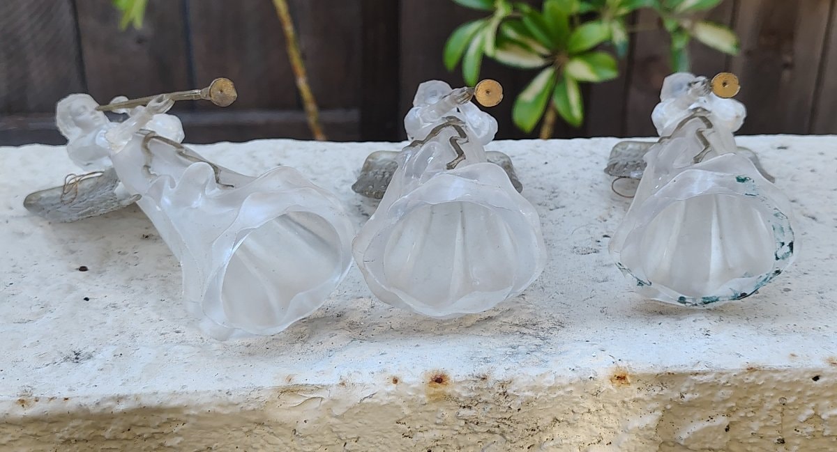 A trio of ethereal herald angels designed to mimic the sophisticated look of frosted French crystal. These figures feature flowing robes, detailed feathered wings, and long trumpets highlighted with gold-tone accents.