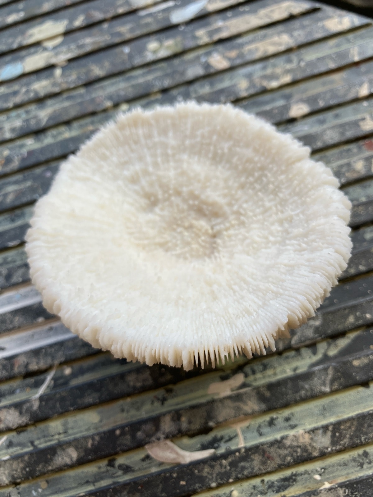This is the calcium carbonate skeleton of a solitary coral known as a Mushroom Coral, prized for its striking radial symmetry.