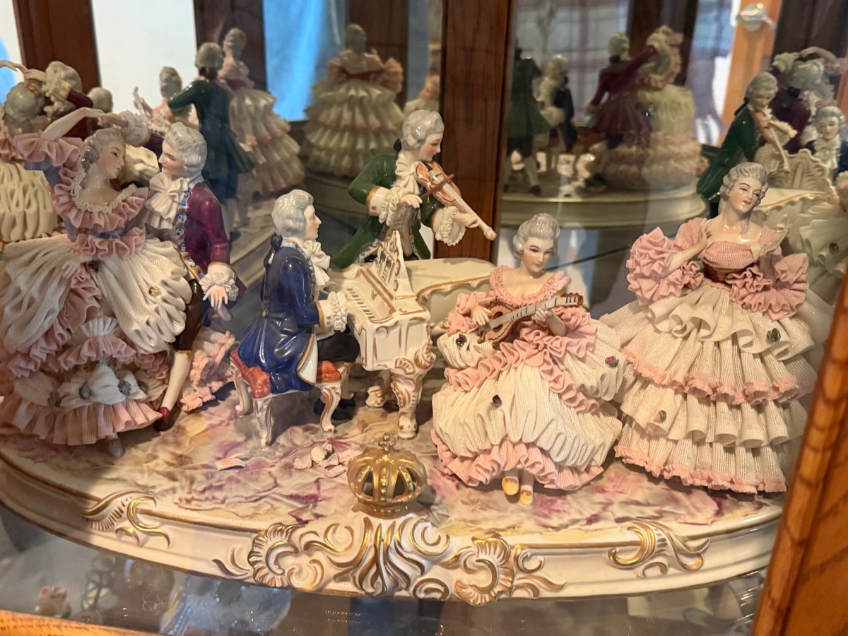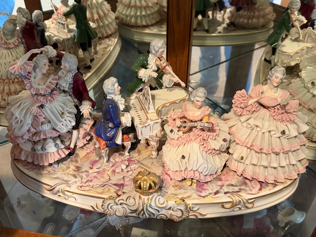 A monumental porcelain figural group featuring a quintet of 18th-century aristocrats, including a pianist, violinist, lute player, and a dancing couple. The piece is famous for its 'Dresden Lace' technique, where real fabric was used to create the impossibly delicate ruffles of the gowns.