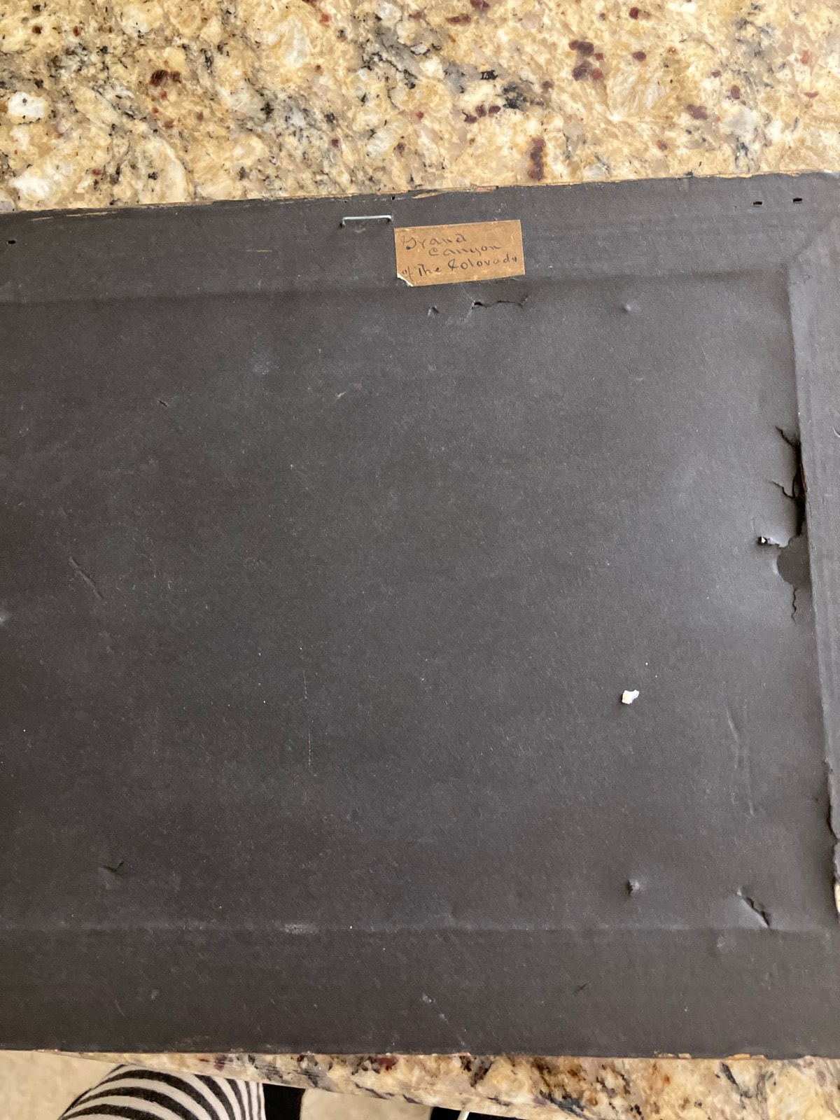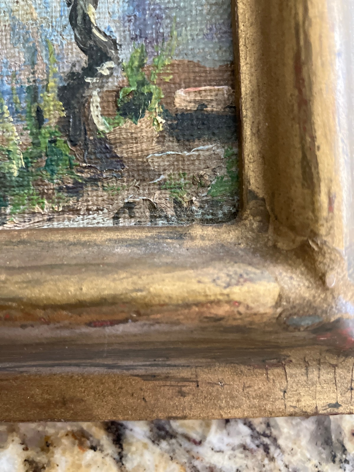 The painting surface appears stable with some minor surface grime consistent with age. The gilded frame shows significant wear, including some loss of the gold finish and cracking in the gesso, which many collectors prefer as it proves the age of the piece. The backing paper is torn, but the original identification label is intact.