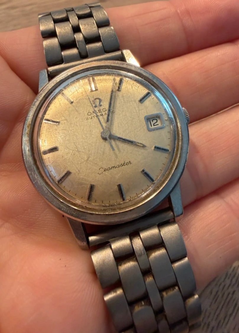 The dial shows a heavy 'stardust' patina or spotting, which some collectors find charmingly 'tropical.' The crystal is heavily scratched but can likely be buffed clear. The case shows honest wear consistent with decades of use, and the bracelet appears to be a later replacement or shows significant plating wear.