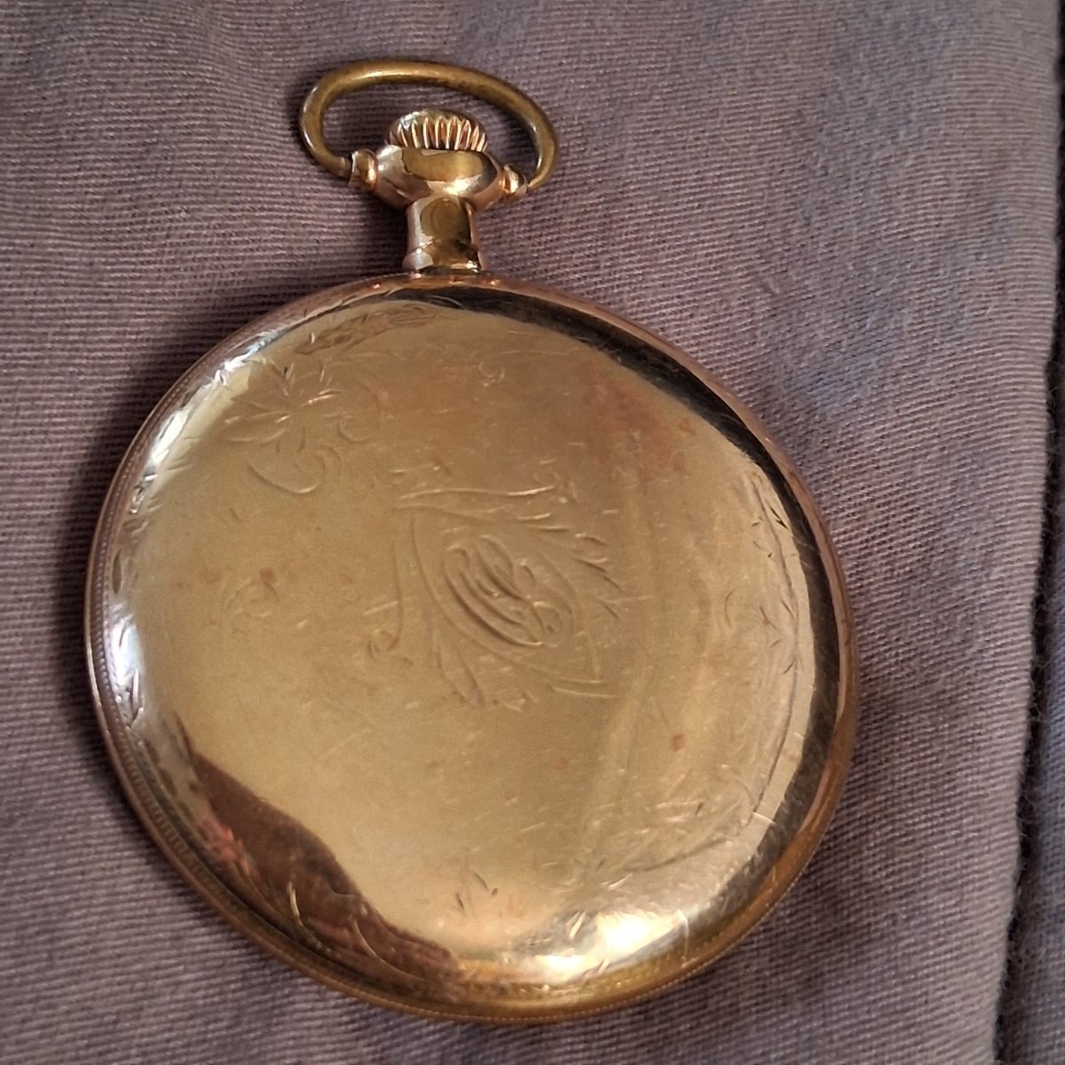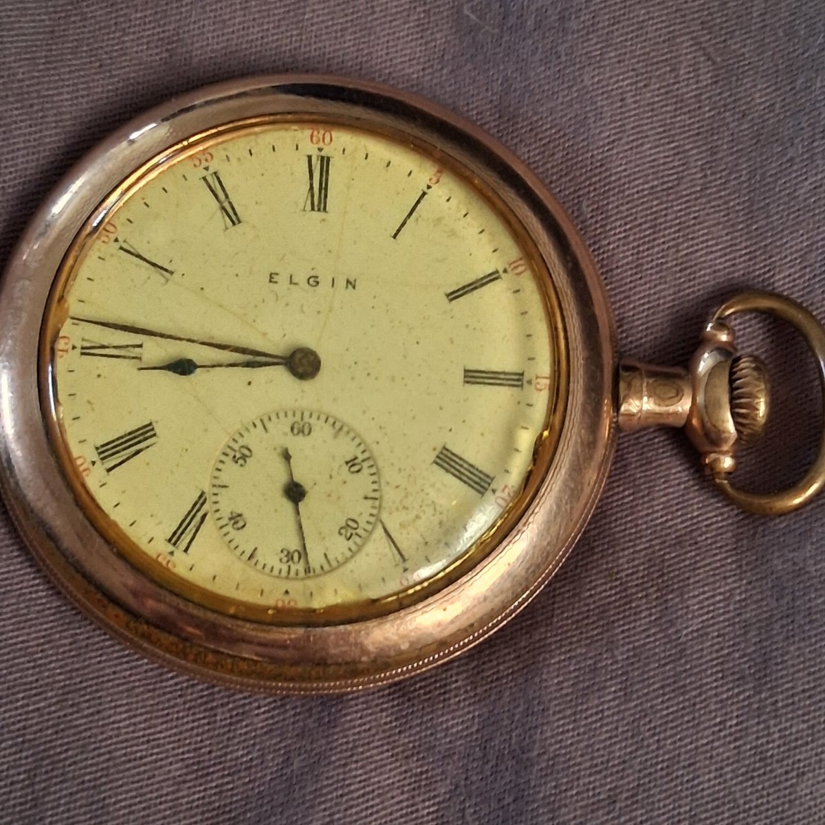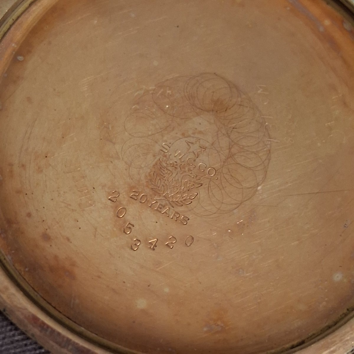 The movement appears remarkably clean with crisp engraving, but the dial shows significant 'freckling' or age-related spotting which is common for this period. The gold-filled case shows expected 'brassing' or wear on the high points of the bow and edges, which is consistent with a century of use.