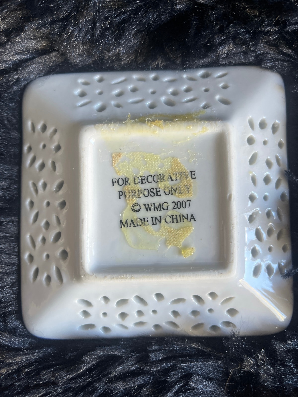 The front of the dish appears to be in good condition with no visible chips. However, the reverse shows significant yellow adhesive residue, likely from a previous price sticker or mounting hardware, which should be cleaned carefully to avoid scratching the glaze.