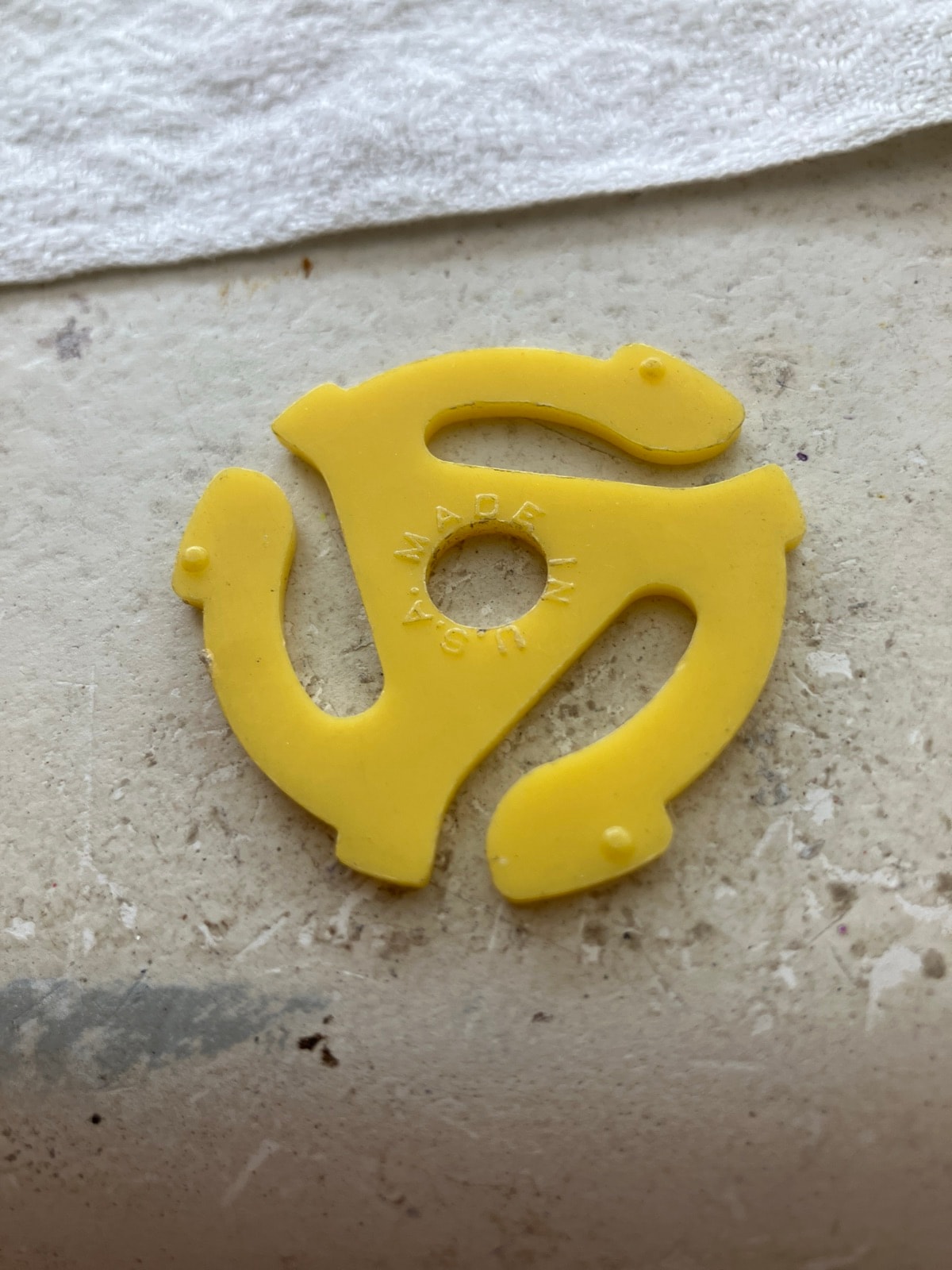 This vibrant yellow plastic insert is a classic piece of Mid-Century industrial design, specifically engineered to bridge the gap between different record formats. Known affectionately as a 'spider,' it allowed the large-hole 45 RPM singles of the rock 'n' roll era to play on standard small-spindle turntables.