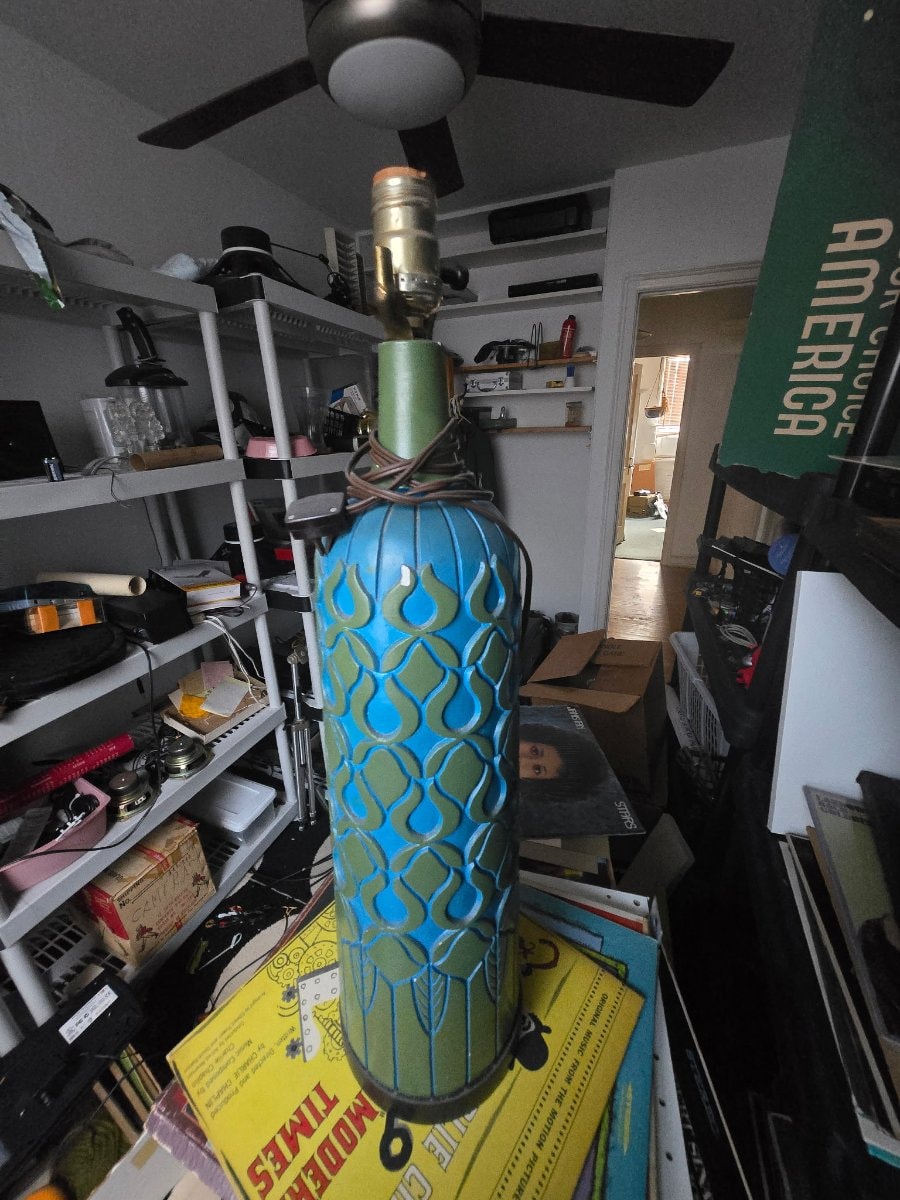 A striking tall ceramic table lamp featuring a high-relief 'Lacrima' (teardrop) pattern in vibrant peacock blue and olive green glazes. This piece represents the pinnacle of post-war Italian art pottery, characterized by its bold textures and the iconic 'Rimini' color palette.