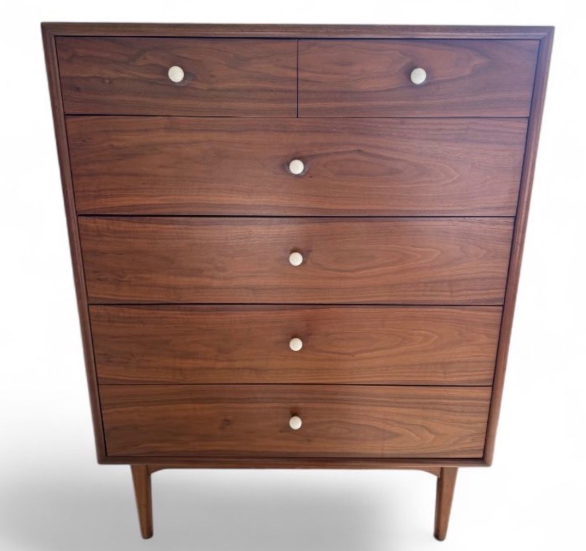 A classic American Mid-Century Modern highboy featuring rich walnut veneers and a distinctive tapered frame. The design showcases the 'floating' aesthetic with a recessed base and elegant white ceramic or porcelain pulls that pop against the dark wood grain.