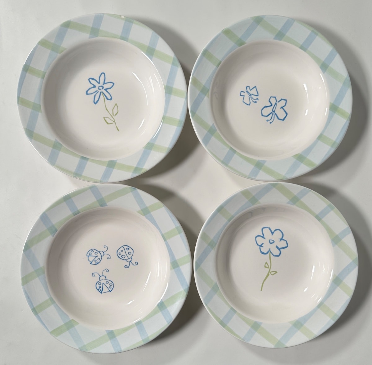 The pieces appear to be in excellent condition with no visible chips or heavy 'crazing' (fine cracks in the glaze). The vibrancy of the blue and green suggests they have been well-cared for and perhaps not subjected to harsh dishwasher cycles. Maintaining a full set without breakage significantly preserves the market value.