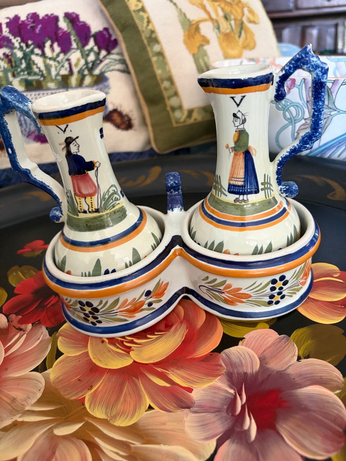 A charming hand-painted faience (tin-glazed earthenware) cruet set featuring the iconic 'Petit Breton' man and 'Petite Bretonne' woman. The set includes two individual pitchers marked 'V' for Vinaigre (Vinegar) and 'H' for Huile (Oil), nestled in a matching double-welled ceramic holder.