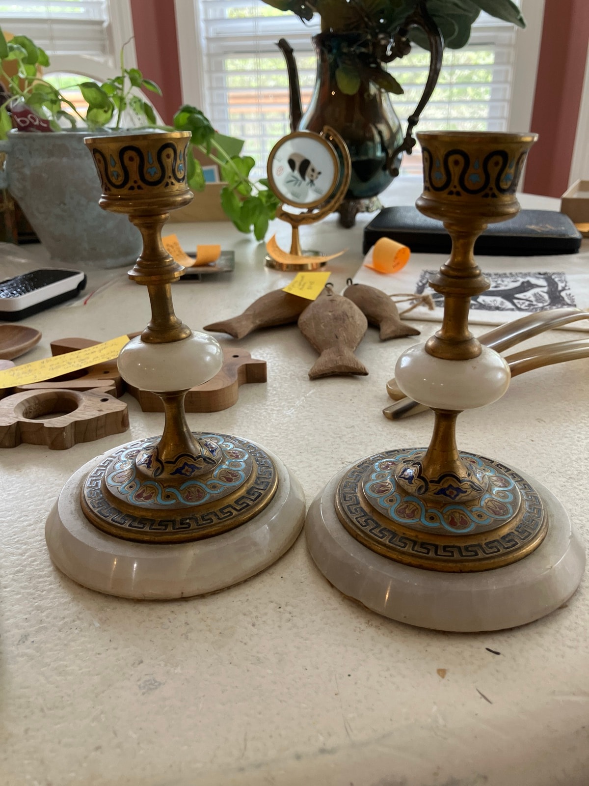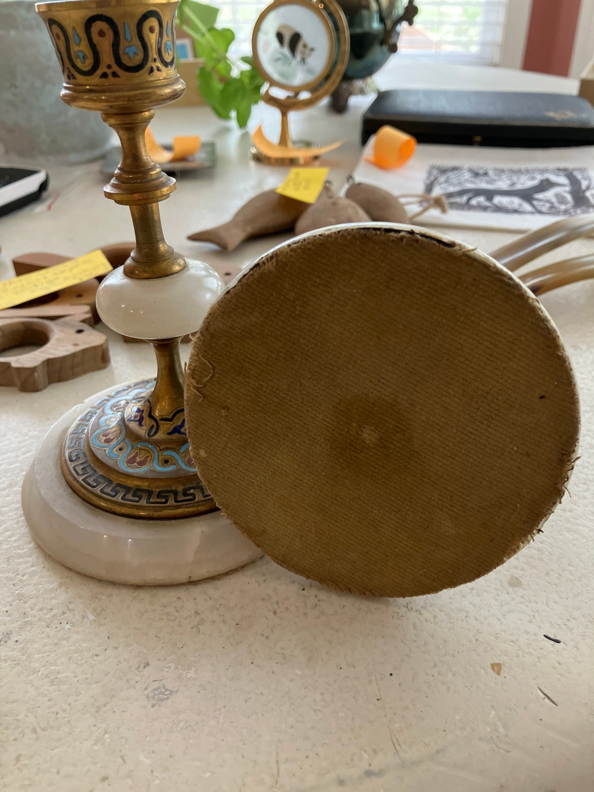 The enamel appears largely intact with vibrant colors. The alabaster shows minor natural veining; check for hairline cracks or 'flea bites' on the base edges. The felt on the underside is a later addition to protect furniture. Condition is excellent for the age.