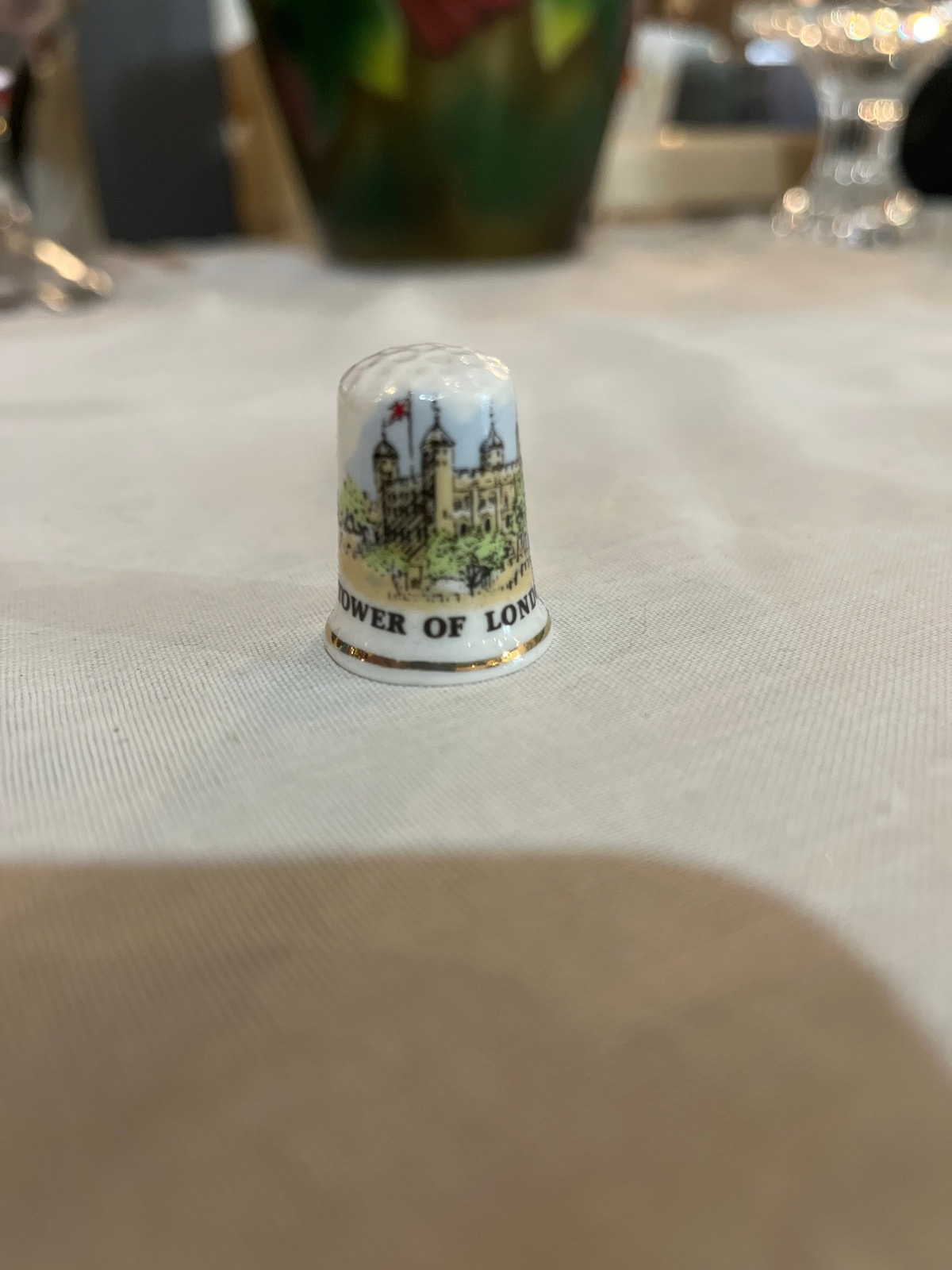 A delicate fine bone china thimble featuring a transfer-printed illustration of the White Tower at the Tower of London. It is finished with a hand-applied 22kt gold band around the base and traditional dimpling on the crown.