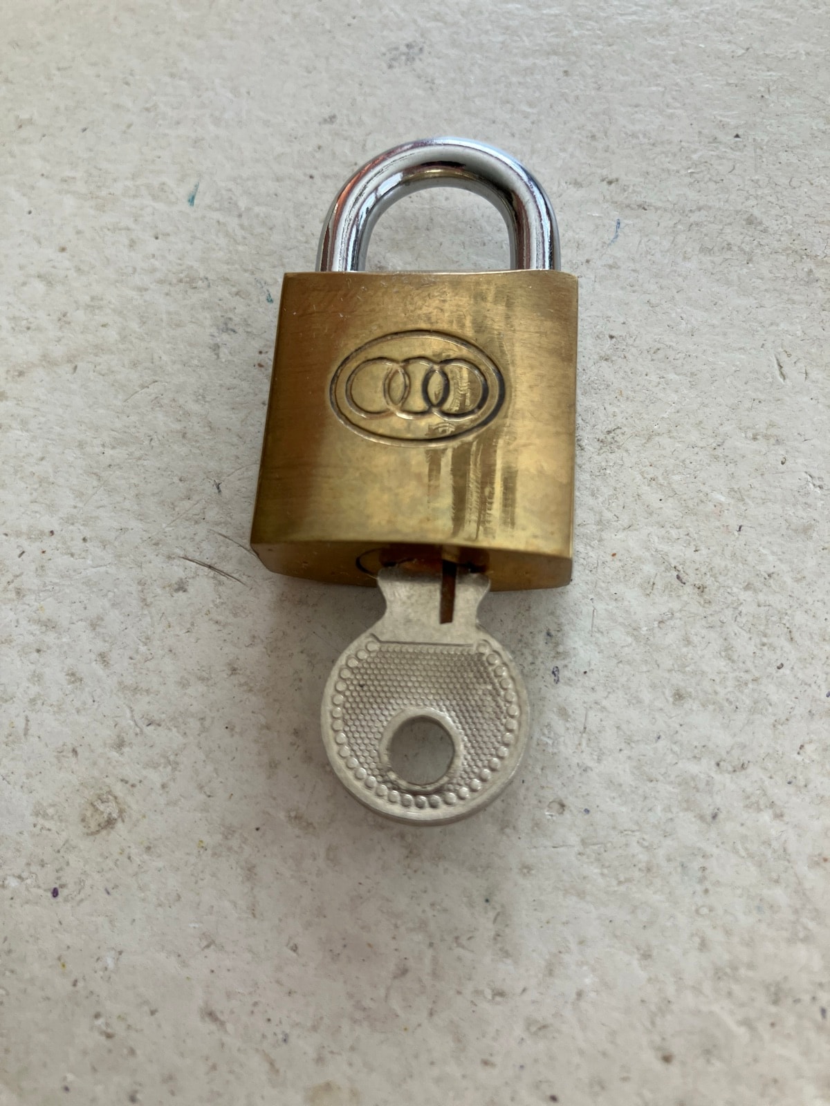 The lock shows typical surface oxidation and minor scratches consistent with age and use. The presence of the original key significantly preserves its utility and collector appeal. The brass has a nice, honest patina that shouldn't be polished away.