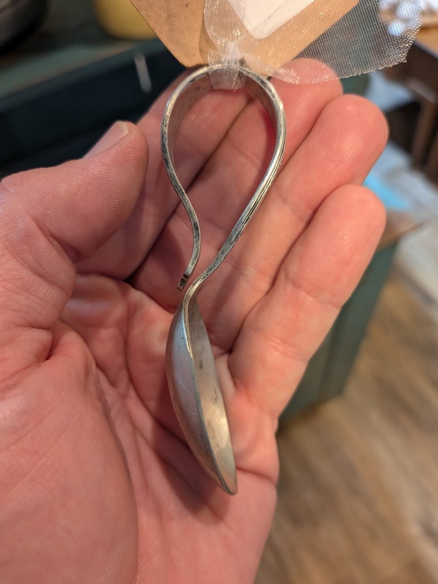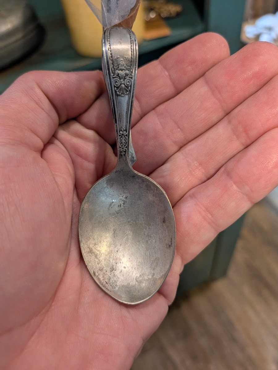 In the late 1800s, these 'bent' spoons revolutionized nursery life. Before this, babies used adult-sized spoons; this ergonomic loop allowed a toddler to maintain a firm grip without the fine motor skills required for a straight handle.