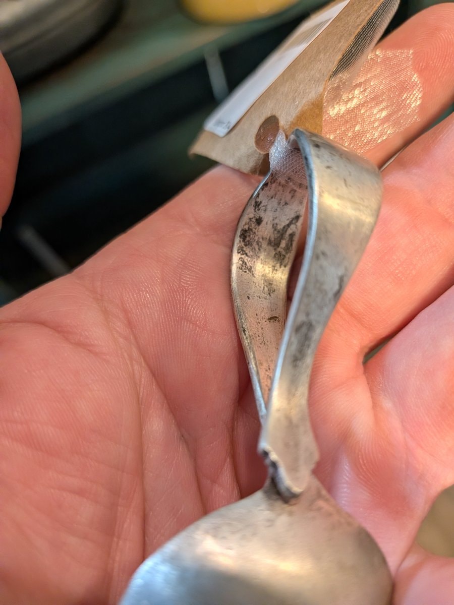 The spoon shows significant tarnish and 'pitting' in the bowl, which is common for silverplate that has seen actual use. The structural integrity of the loop remains excellent, though the surface wear reduces the value compared to a polished, mint-condition piece. Cleaning may reveal more detail but could also expose more base metal.