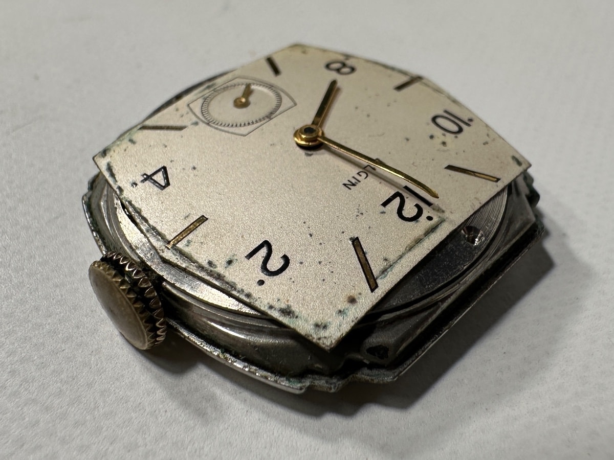 The watch is currently in a disassembled state without a crystal or strap. The dial shows significant 'foxing' or spotting consistent with age, and the case has minor surface scratches. These factors reduce the immediate value by approximately 60-70% compared to a running, serviced example.