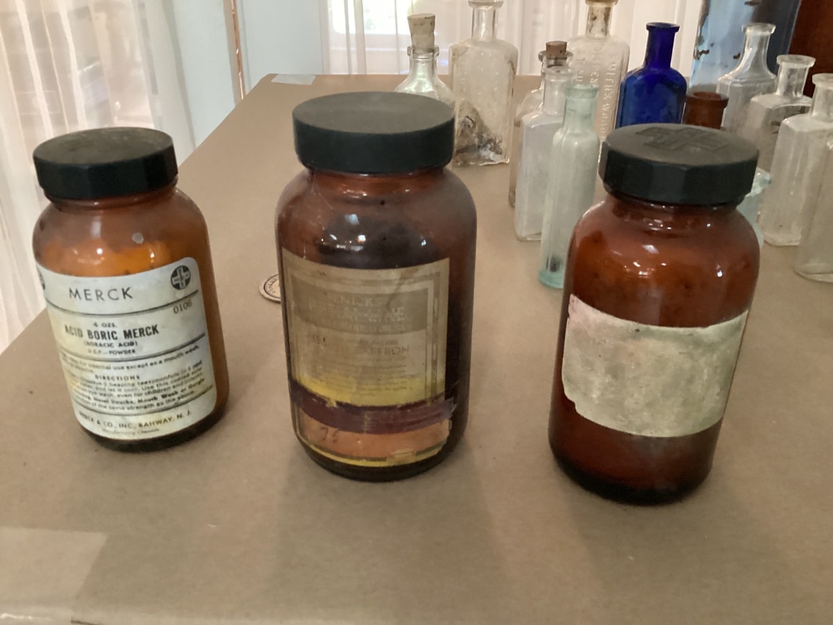 Before modern blister packs, pharmacists hand-mixed remedies from bulk jars like these. The Merck jar from Rahway, NJ, marks a time when Boric Acid was a household staple for everything from eye washes to antiseptic powders.