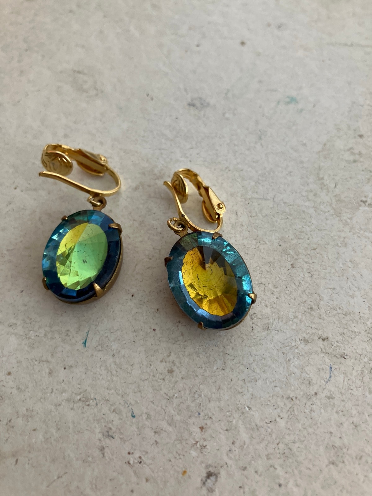 The stones show some minor surface abrasions and 'flea bites' consistent with age. The gold-tone finish on the clips appears well-preserved, though slight oxidation is visible on the earring prongs. Minor wear to the iridescent coating reduces value slightly.