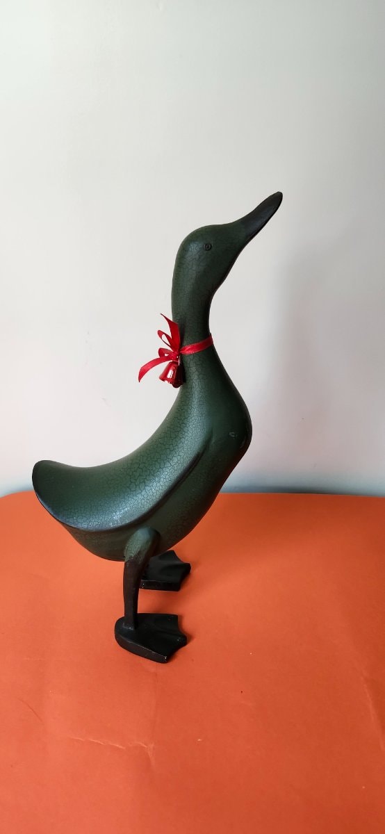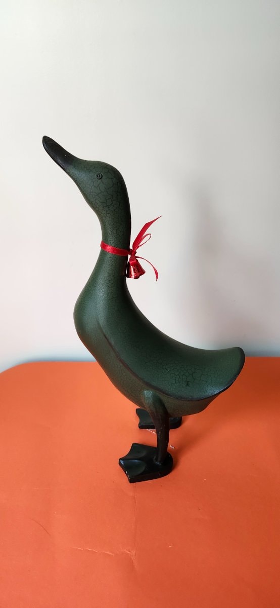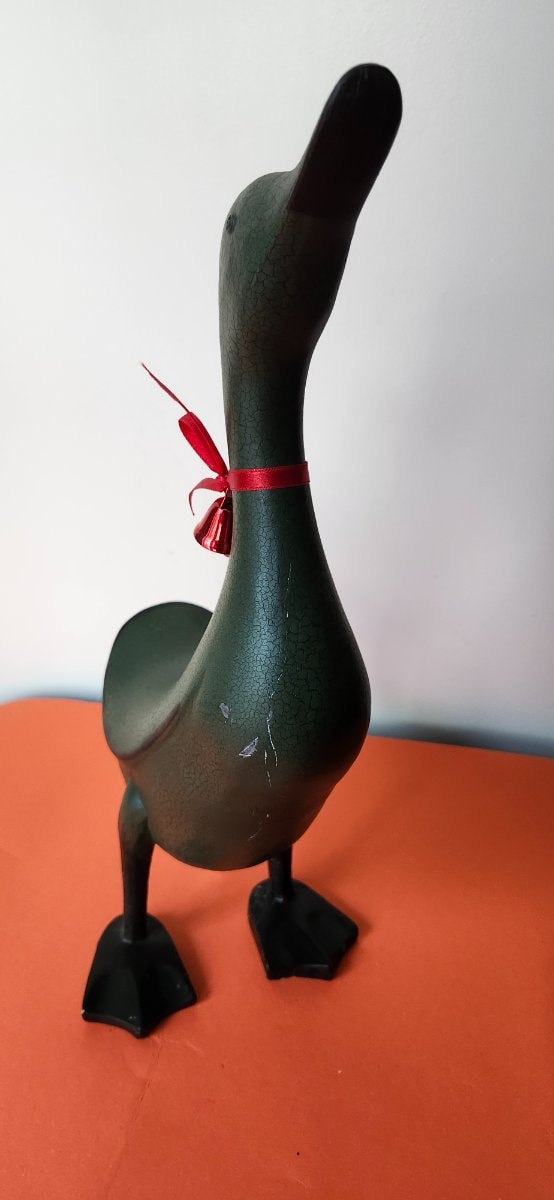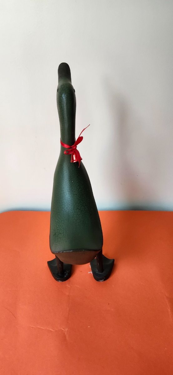This is a whimsical, elongated figurine of an Indian Runner duck, characterized by its distinctive upright 'penguin-like' posture.