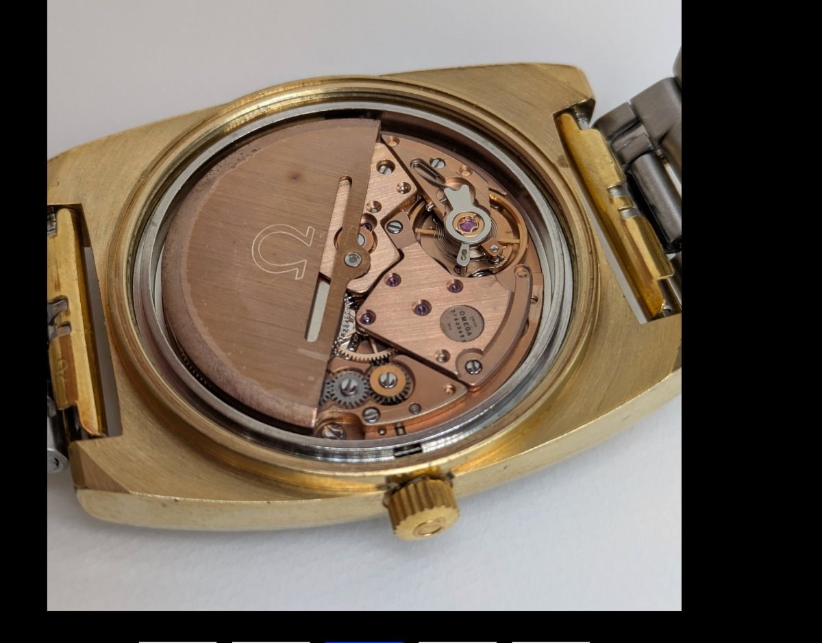 A classic 1970s 'TV-screen' shaped timepiece featuring a stunning gradient fumé dial and a high-beat Swiss automatic movement. This model represents Omega's transition into the bold, geometric aesthetics of the disco era while maintaining their legendary mechanical precision.