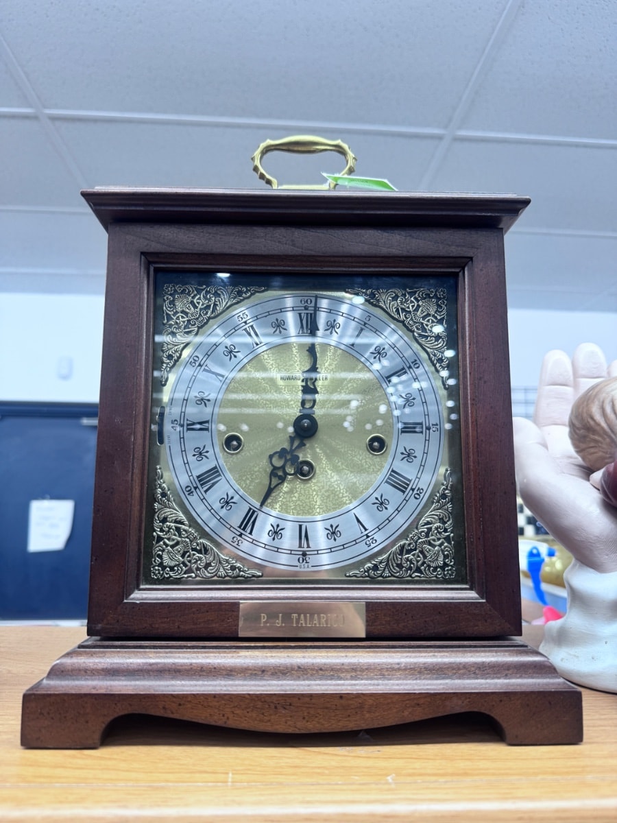 Founded in 1926, Howard Miller became the gold standard for American timekeeping. This clock likely marked a major career milestone for P. J. Talarico, serving as a daily reminder of a lifetime of dedicated service through its rhythmic chimes.