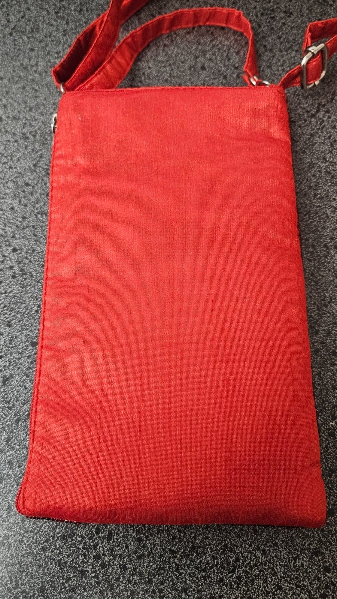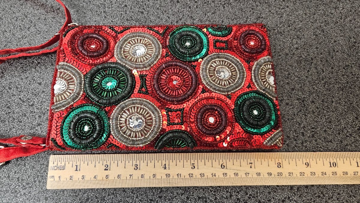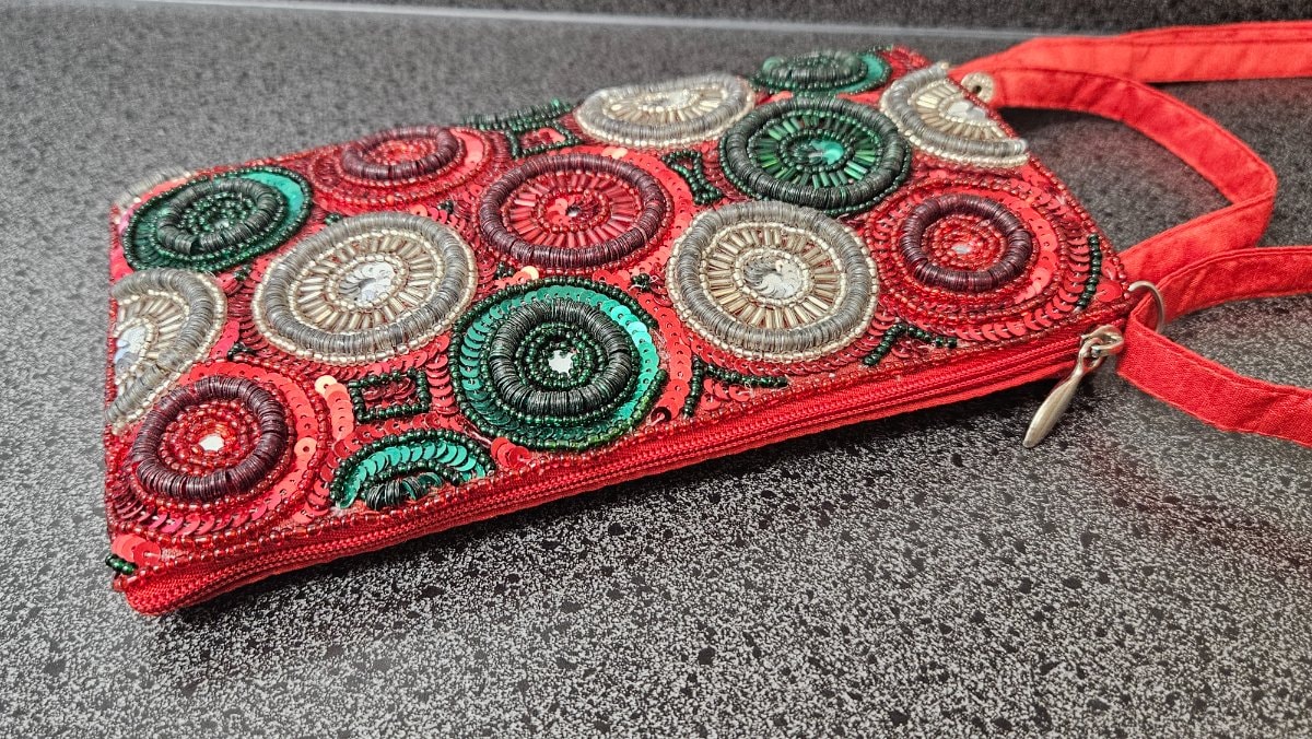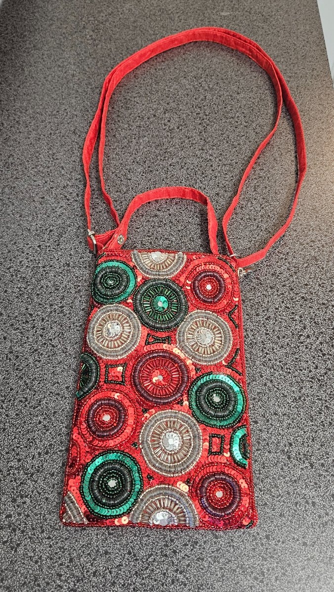 A vibrant, hand-beaded smartphone crossbody bag featuring a rhythmic geometric pattern of concentric circles in crimson, emerald, and silver. This 'Club Bag' is designed for modern utility, featuring a slim profile, a secure zip closure, and a versatile strap system that allows it to be worn as a crossbody or a wristlet.
