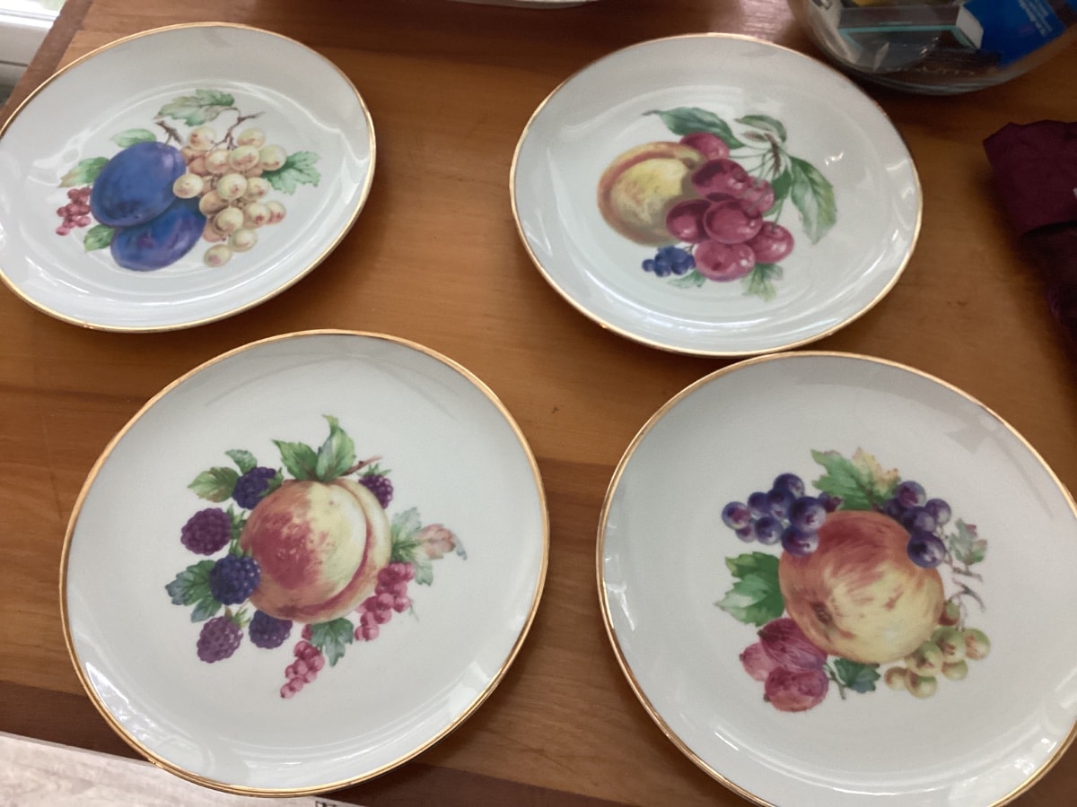 The plates appear to be in very good vintage condition with vibrant colors. The gold rims show minimal rubbing, which is the primary factor in maintaining their value. Condition is excellent. Individual Kaiser fruit plates typically sell for $15-$25 each, while a coordinated set of four in excellent condition commands a premium.