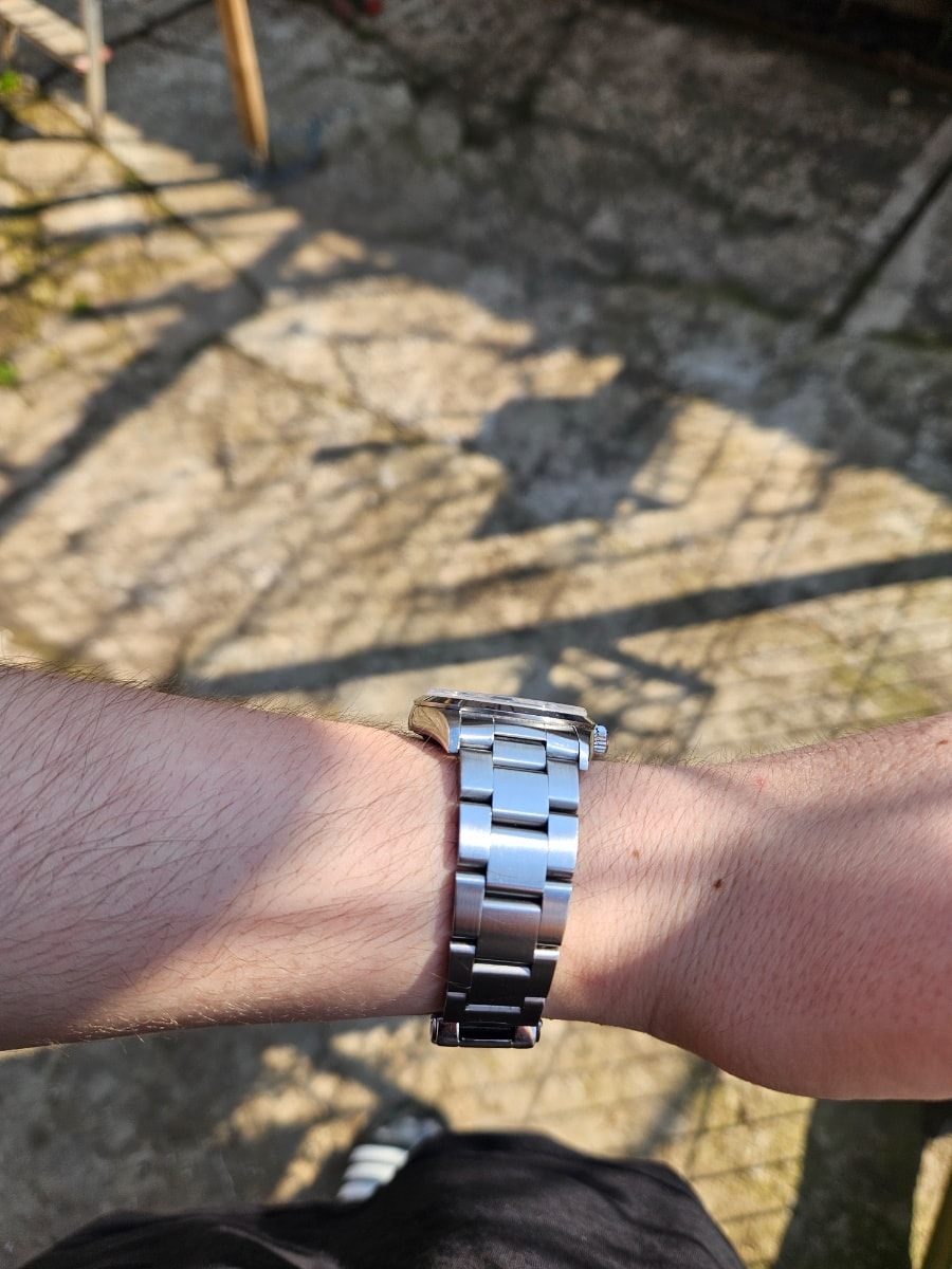 Consistent with the owner's 7/10 assessment, there are visible 'desk diving' scratches on the bezel and bracelet links. The mentioned marks on the sapphire crystal are common for daily-worn pieces but usually necessitate a crystal replacement during service to ensure water resistance.
