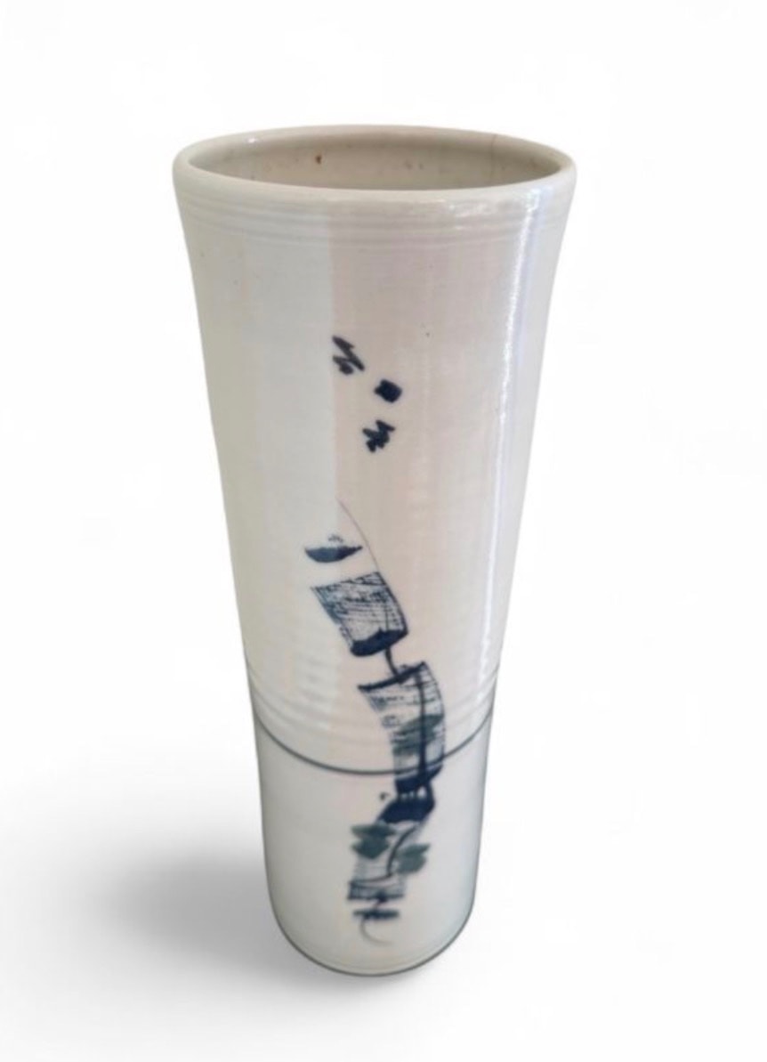 Post-war potters broke away from industrial perfection to embrace the 'mark of the maker.' This vase captures a single moment of movement, where the artist used cobalt like ink on paper. It represents a time when clay became a medium for fine art.