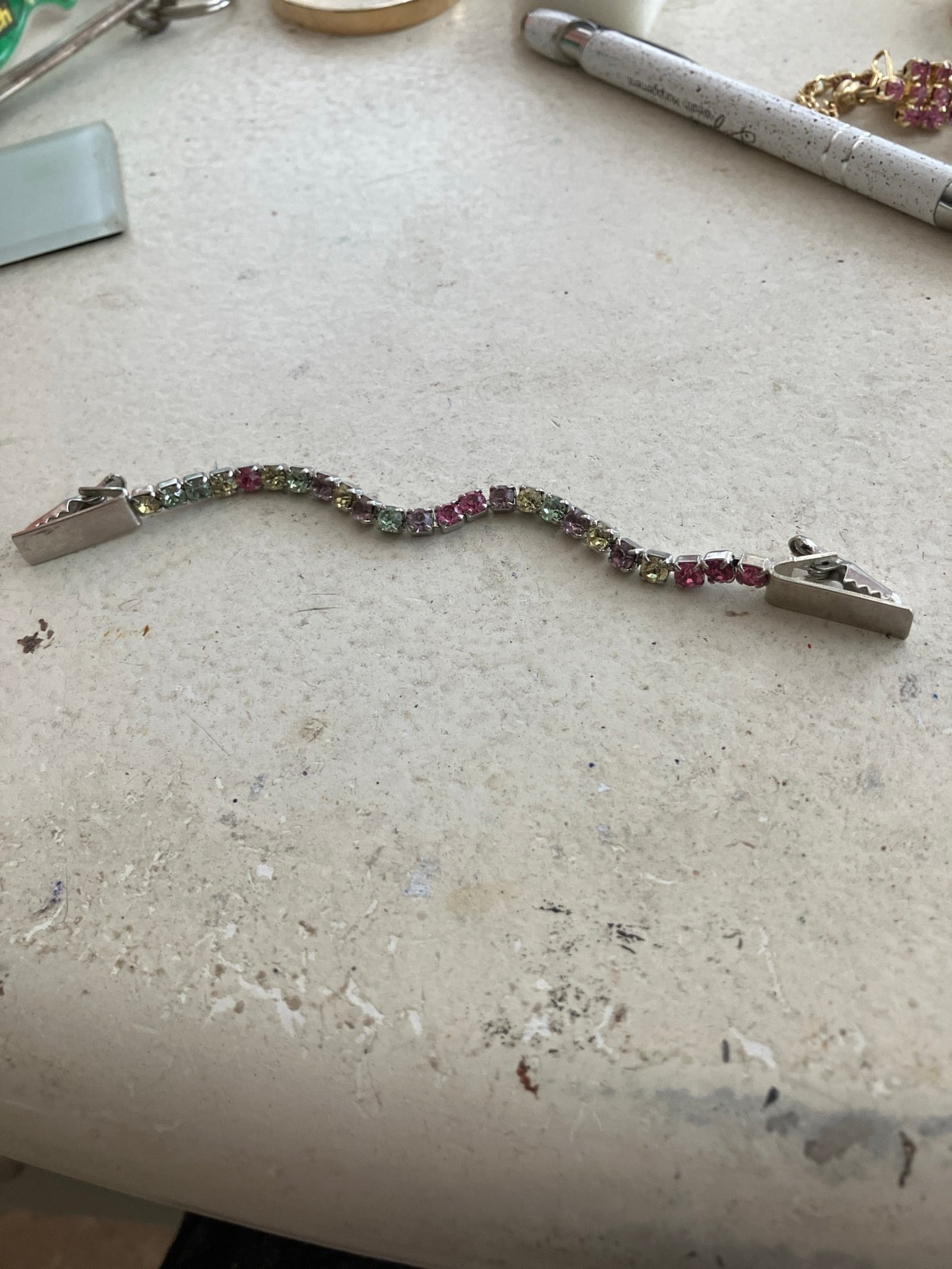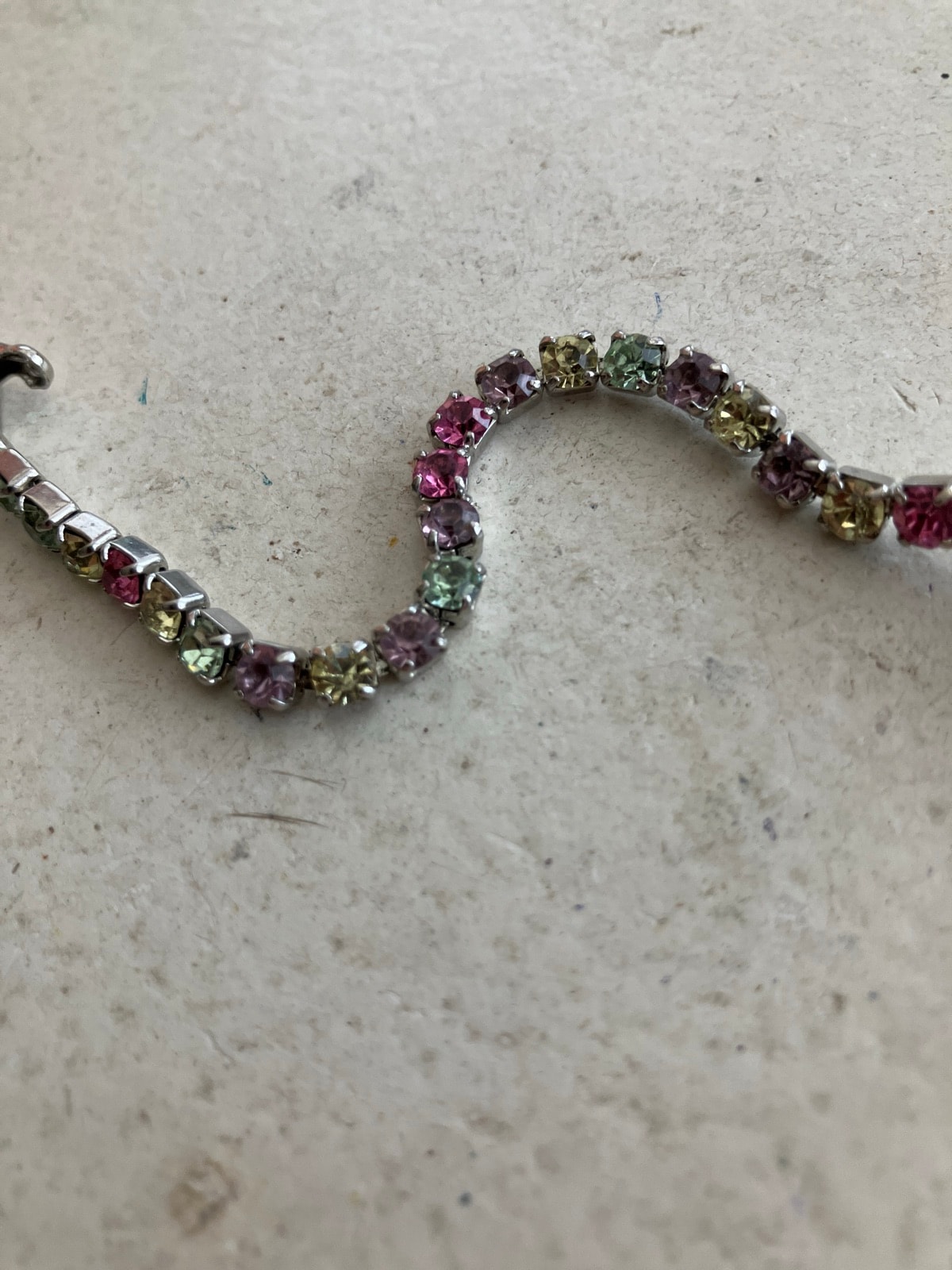 A charming mid-century accessory featuring a flexible line of multi-colored pastel rhinestones in a silver-tone rhodium-plated setting. Designed with two alligator-style clips at either end, it was intended to hold a cardigan draped over the shoulders in place.