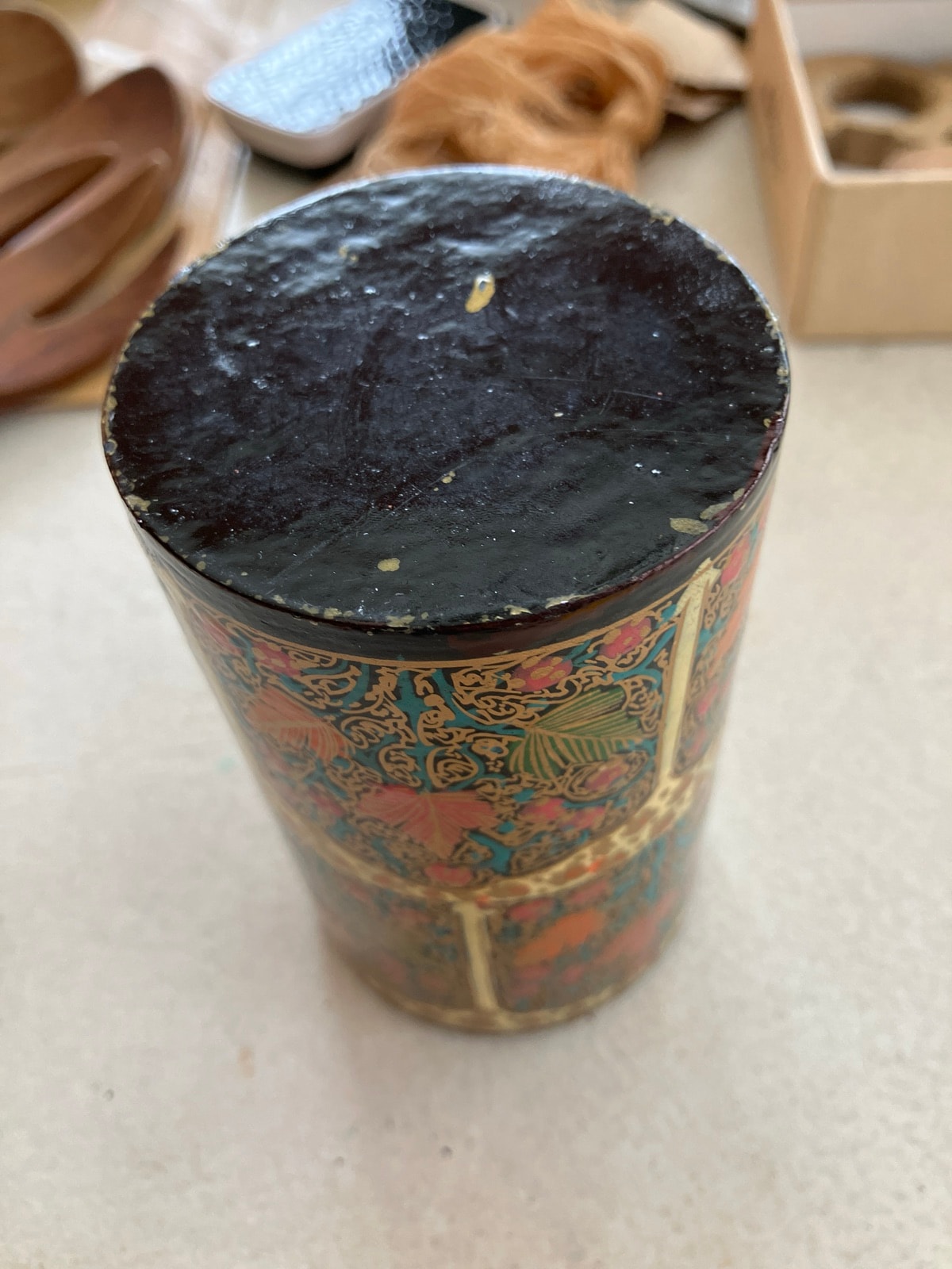 The lacquer appears well-preserved with a high gloss, though there is minor wear visible along the top rim and base edge. The interior remains a clean, solid black, suggesting it was used gently as a decorative piece rather than a heavy-duty tool holder. Excellent preservation of the pigments.