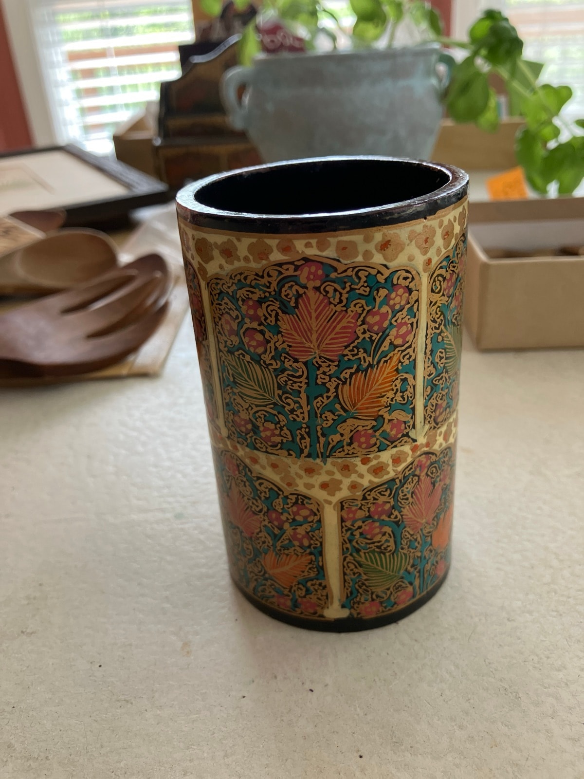A classic cylindrical 'brush pot' or pen holder featuring the intricate 'Naqashi' hand-painting style characteristic of the Kashmir Valley. The surface is divided into arched panels filled with vibrant floral motifs and the iconic Chinar leaf, all protected by a deep, hand-polished lacquer.
