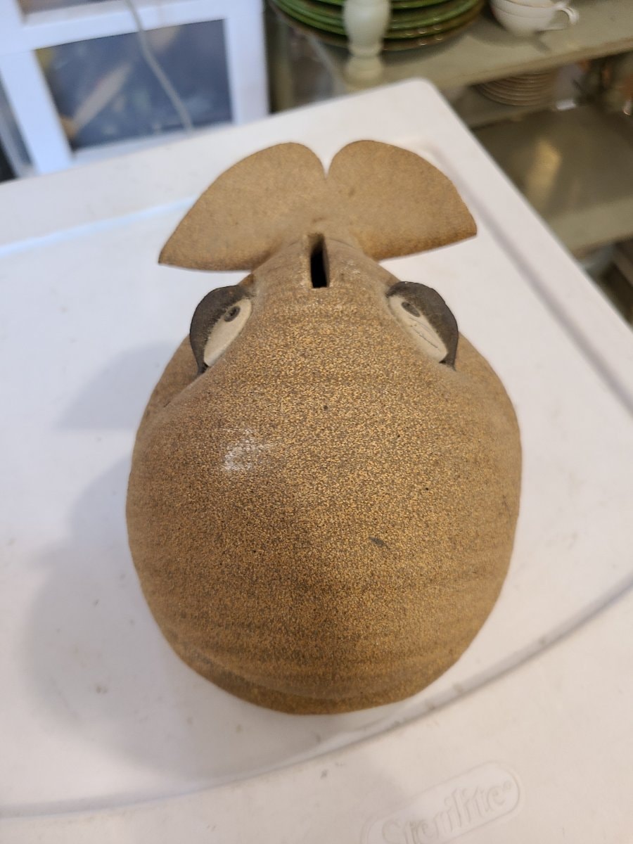This is a hand-thrown and altered stoneware coin bank, masterfully transformed into a whimsical walrus with a rich, sandy-textured exterior.