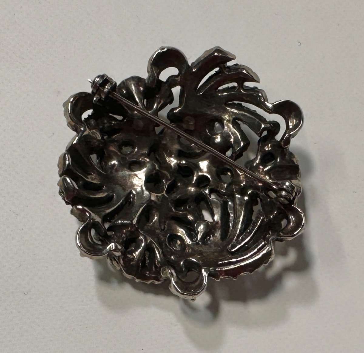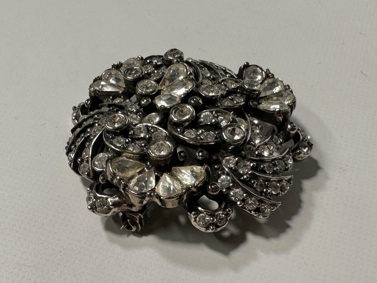 The rhinestones appear remarkably clear with no visible 'dead' or yellowing stones, which is the primary driver of value in vintage crystal. The rhodium plating is in excellent condition with no significant pitting or wear to the back. The safety clasp is intact and functional. Excellent condition for its age.