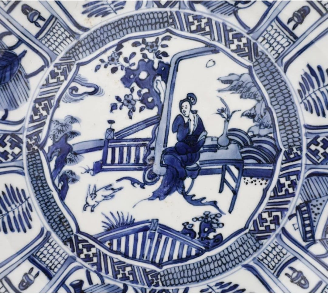 Named after the Portuguese 'carracks' that first carried them, these plates became the ultimate status symbol in 17th-century Europe. This specific scene likely depicts Chang'e, the Moon Goddess, and her companion, the Jade Rabbit, who was believed to live on the moon grinding the elixir of immortality.