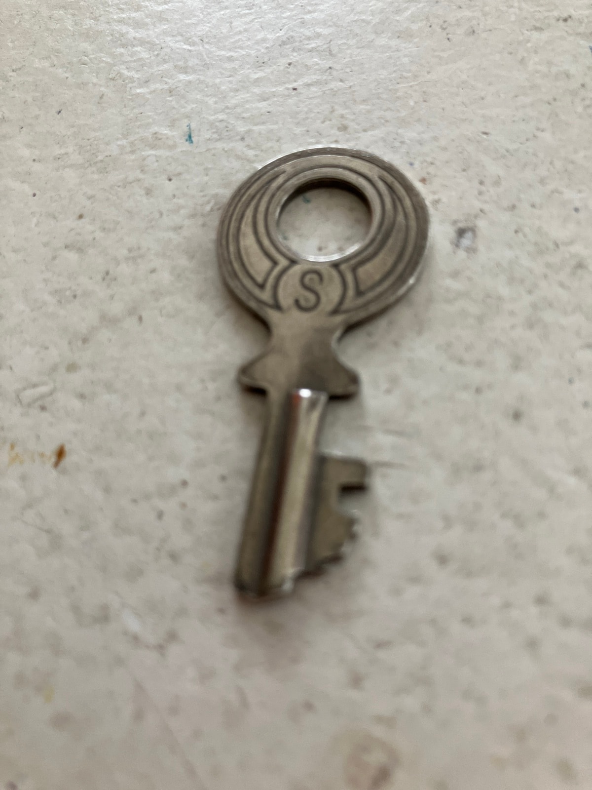 A vintage hollow-barrel skeleton key featuring the distinctive 'S' logo of the Slaymaker Lock Company. This style of key was designed for warded locks, commonly used on padlocks, lockers, and furniture cabinets during the height of American industrial manufacturing.