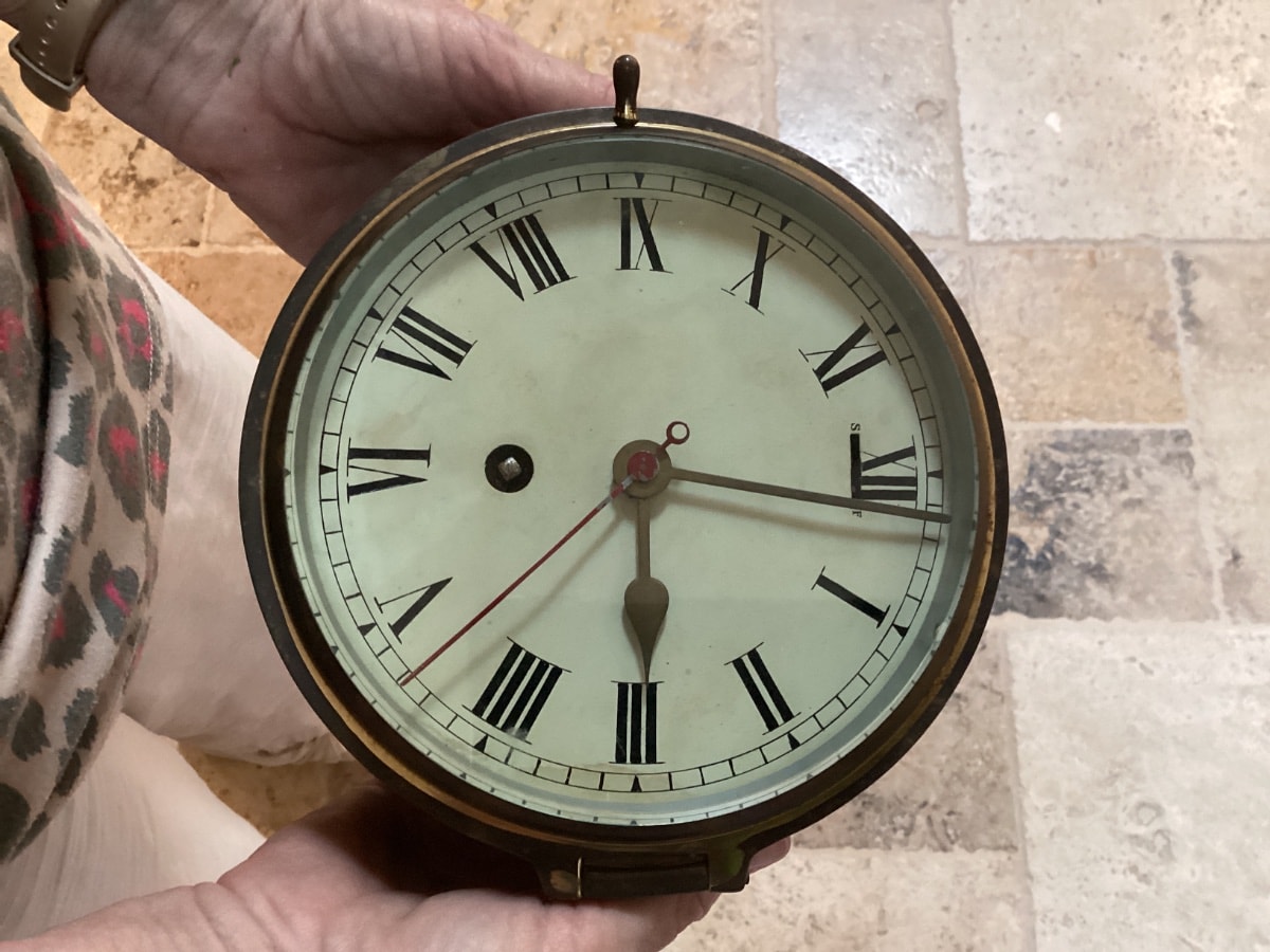 A heavy brass-cased marine bulkhead clock featuring a classic Roman numeral dial and a sweep seconds hand. These robust timepieces were engineered to withstand the vibration and corrosive salt air of life at sea.