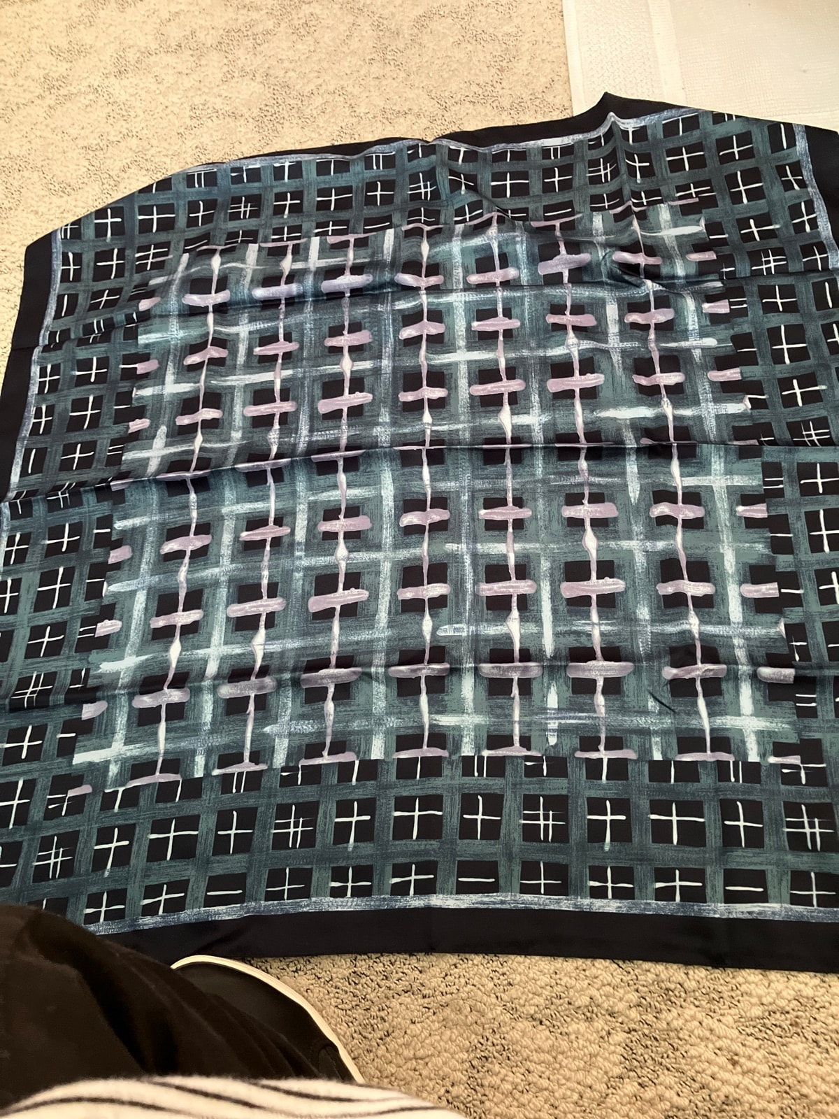 A high-quality Italian silk twill scarf featuring a sophisticated geometric grid pattern with painterly, hand-brushed textures. The design utilizes a moody palette of slate blue, lavender, and charcoal, framed by a classic solid border.