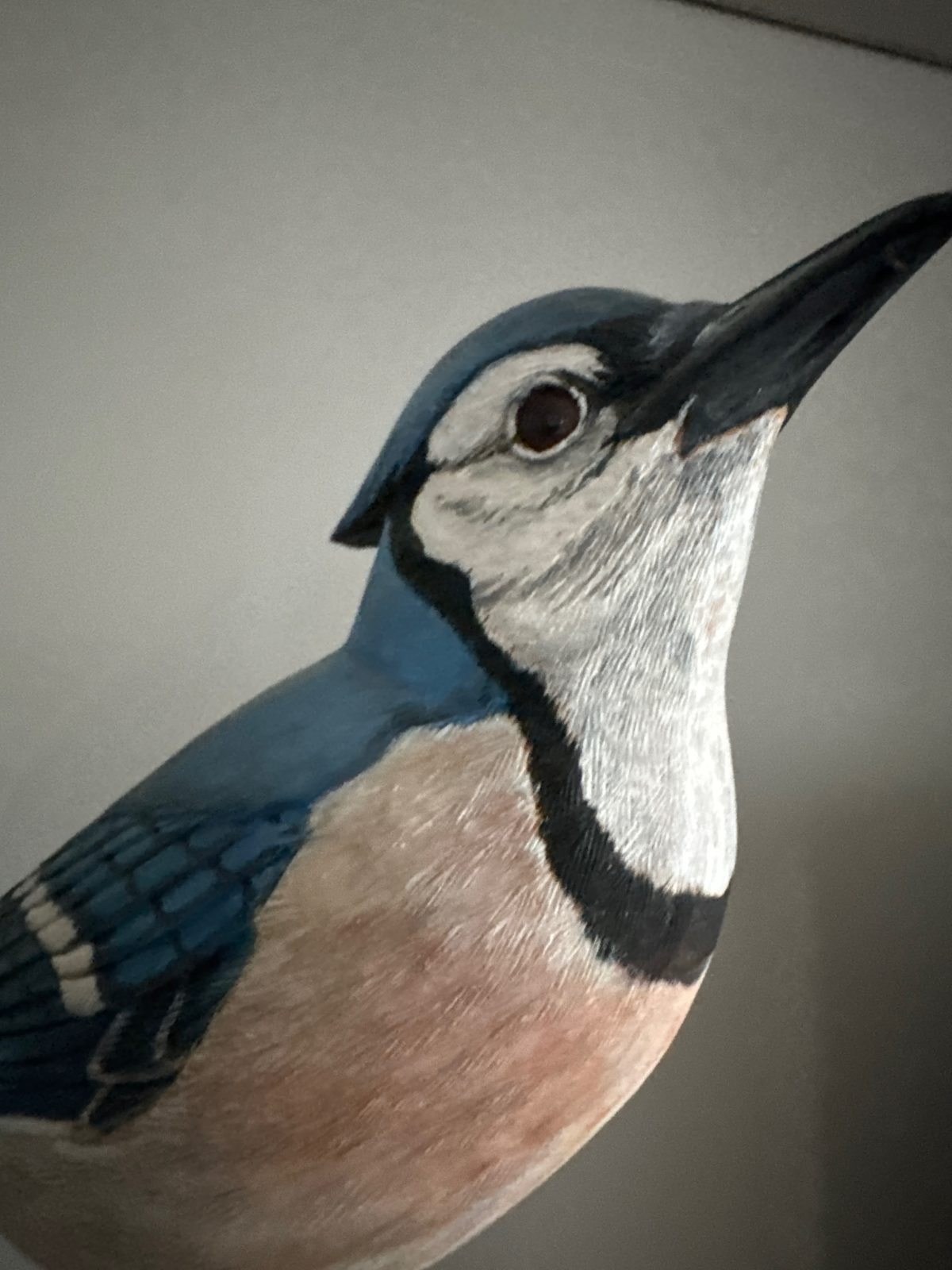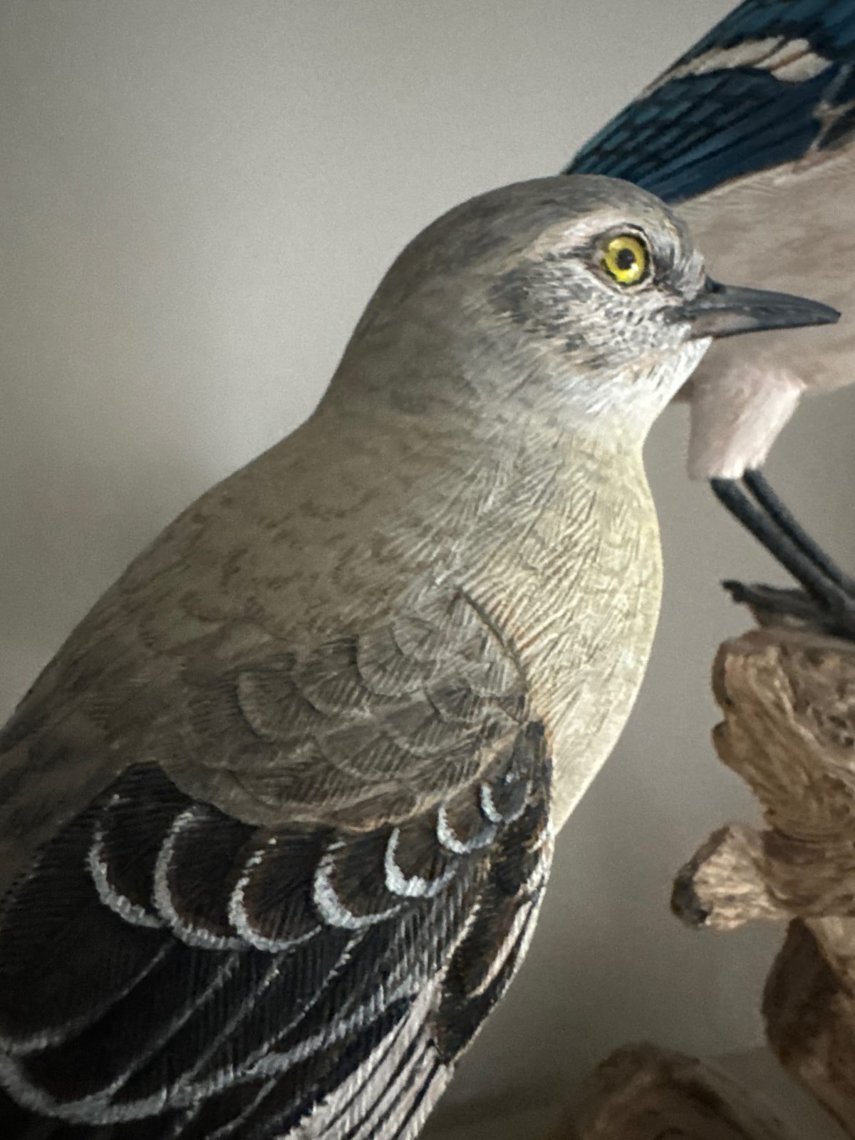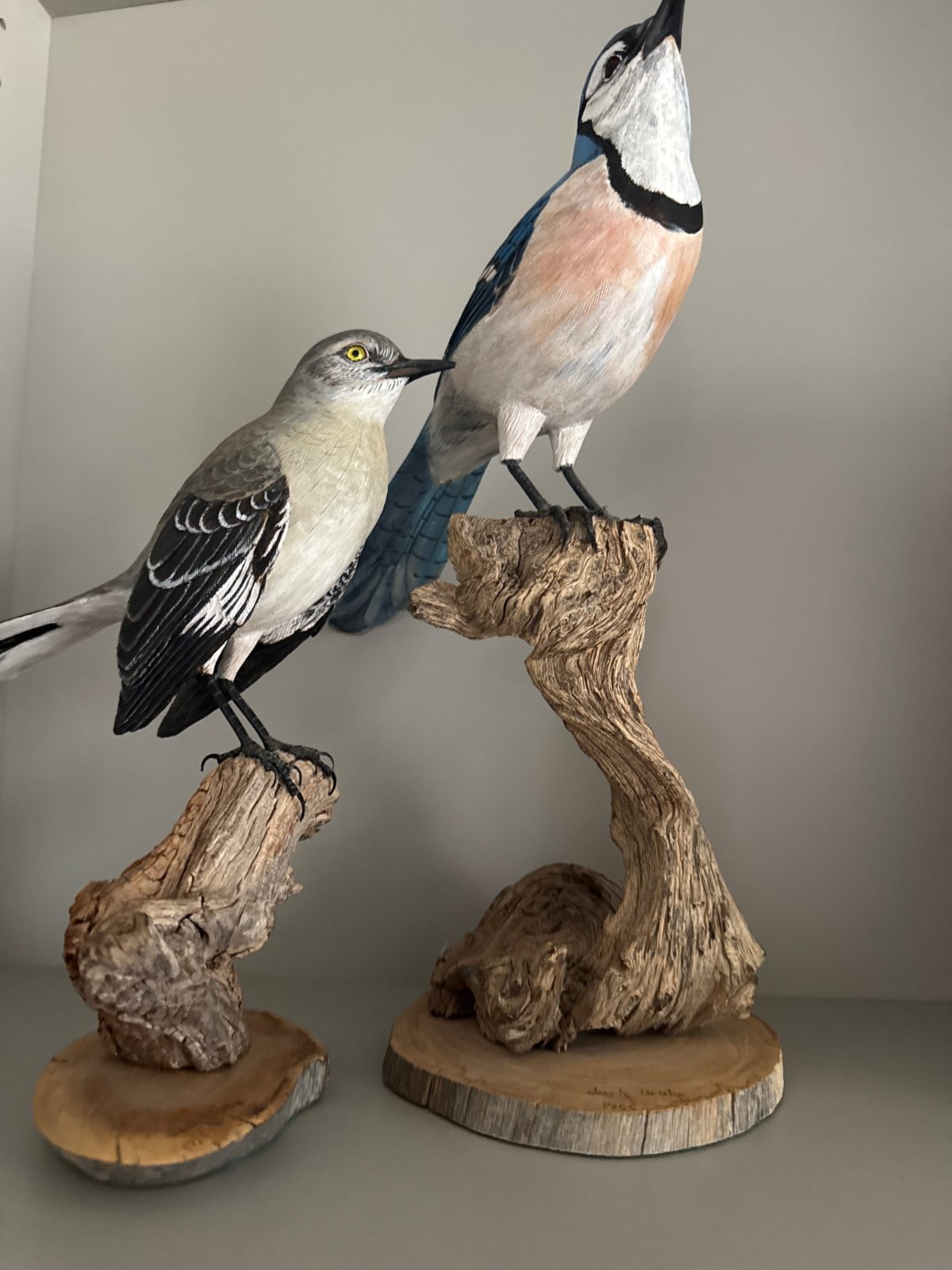 A pair of highly detailed, life-sized bird sculptures—a Northern Mockingbird and a Blue Jay—hand-carved from basswood and mounted on natural wood bases. These pieces feature intricate 'burning' techniques to simulate the delicate texture of individual feathers.