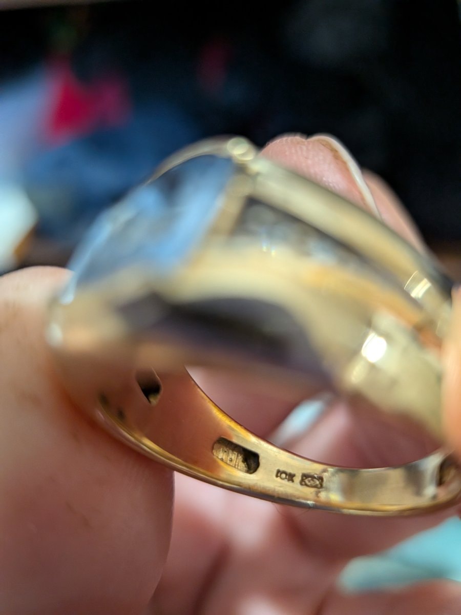 While the specific geometric maker's mark next to the 10k stamp is a common hallmark of American jewelry manufacturers from the late 20th century, it signifies a piece made during the peak of the 'mall jewelry' golden age.