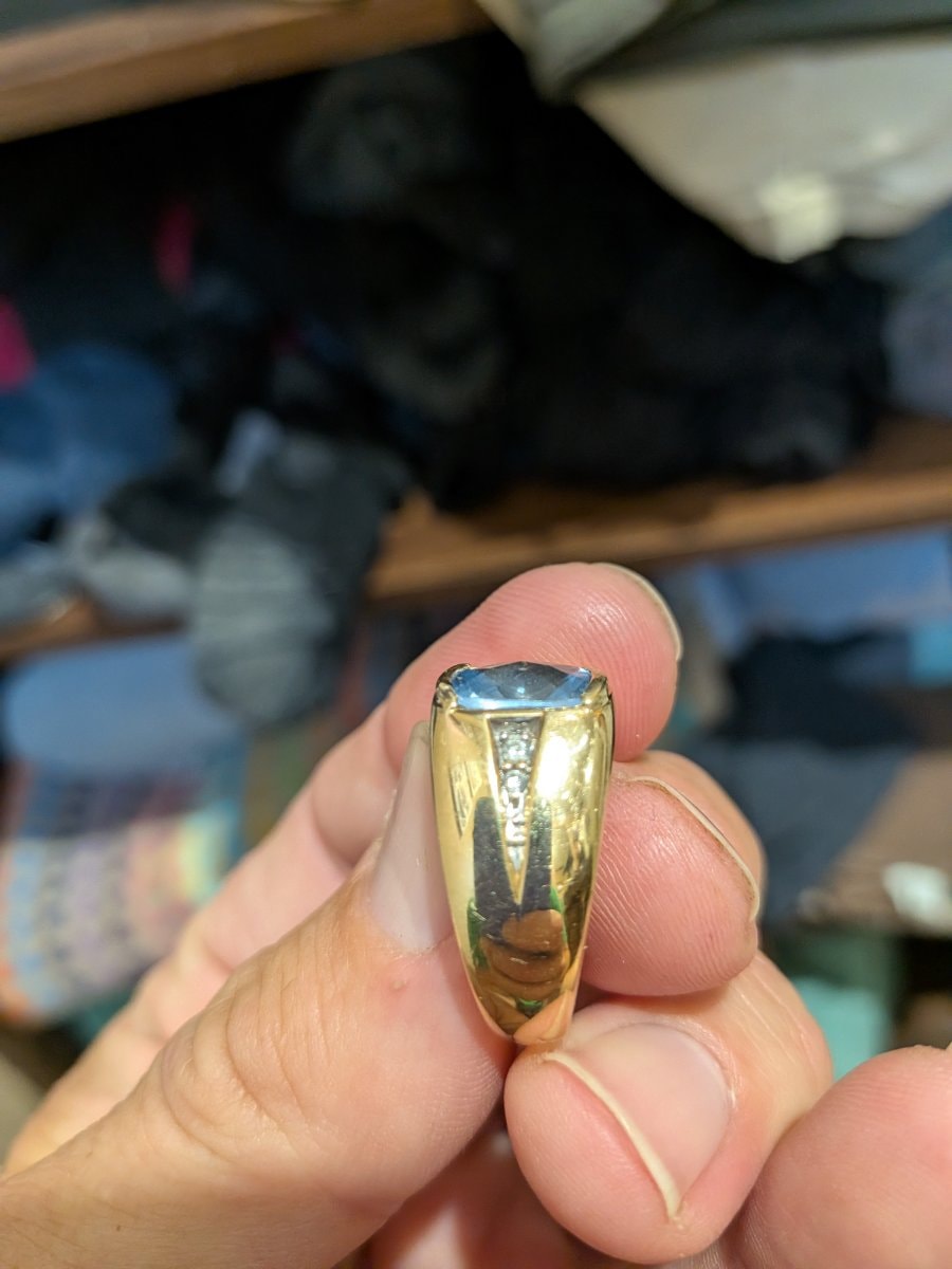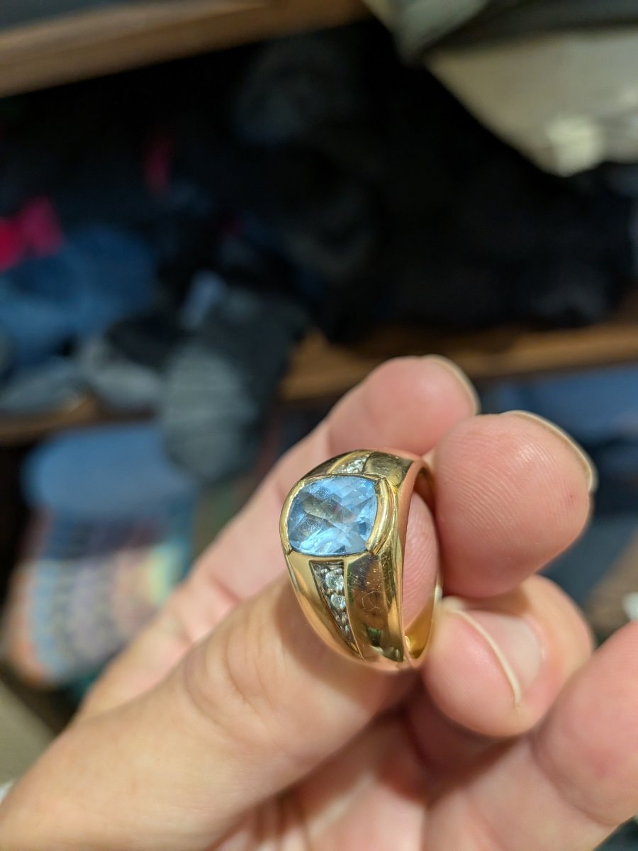 The gold shows moderate surface scratching and 'pocket wear' consistent with regular use over several decades. The central topaz appears to have some minor facet-edge wear, which is typical for this gemstone; a professional cleaning and light buffing would significantly enhance its brilliance.