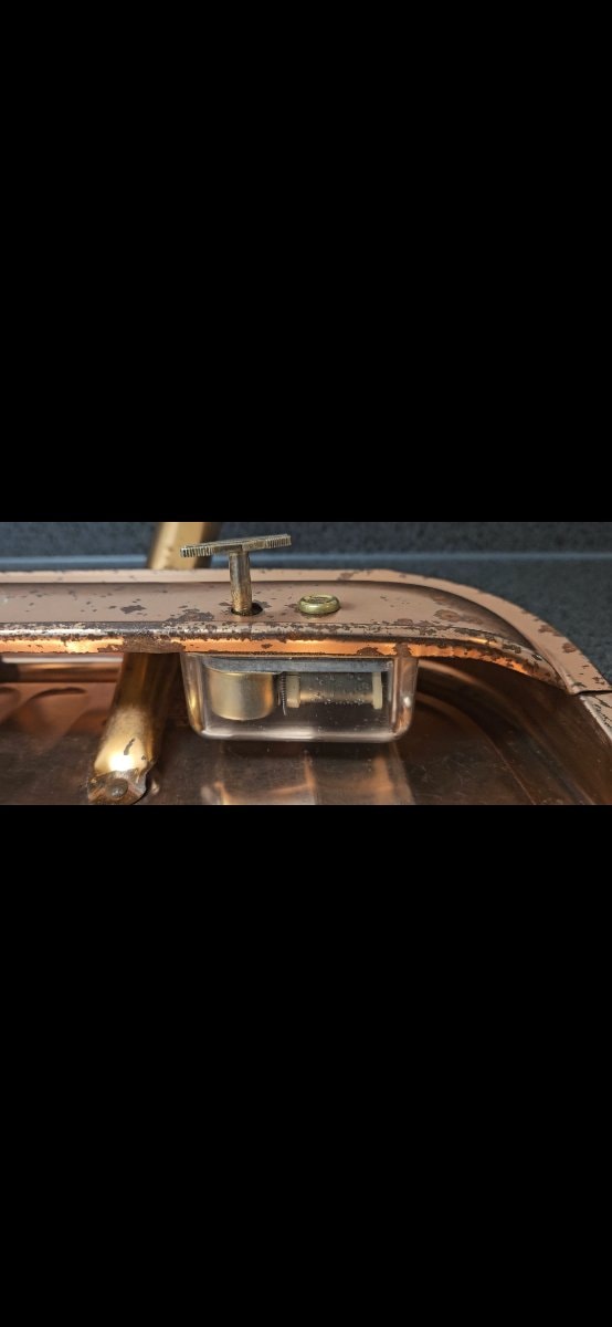 The copper-toned finish shows significant surface rust and pitting, particularly along the top hood and handle. The white plastic edge appears intact, but the overall patina suggests heavy use. Condition reduces value by approximately 50% compared to a mint-condition example. Value is driven by the novelty of the music box.