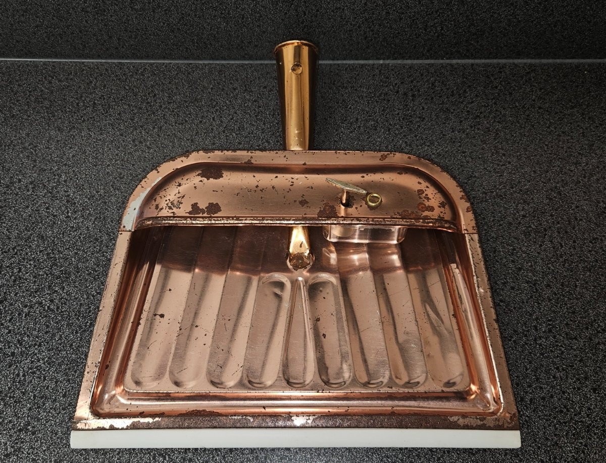 A charming piece of 1970s kitchen novelty, this copper-toned metal dustpan features a built-in wind-up music box. Part of the 'Neat 'n Tidy' line, it was designed to transform a mundane household chore into a cheerful experience.