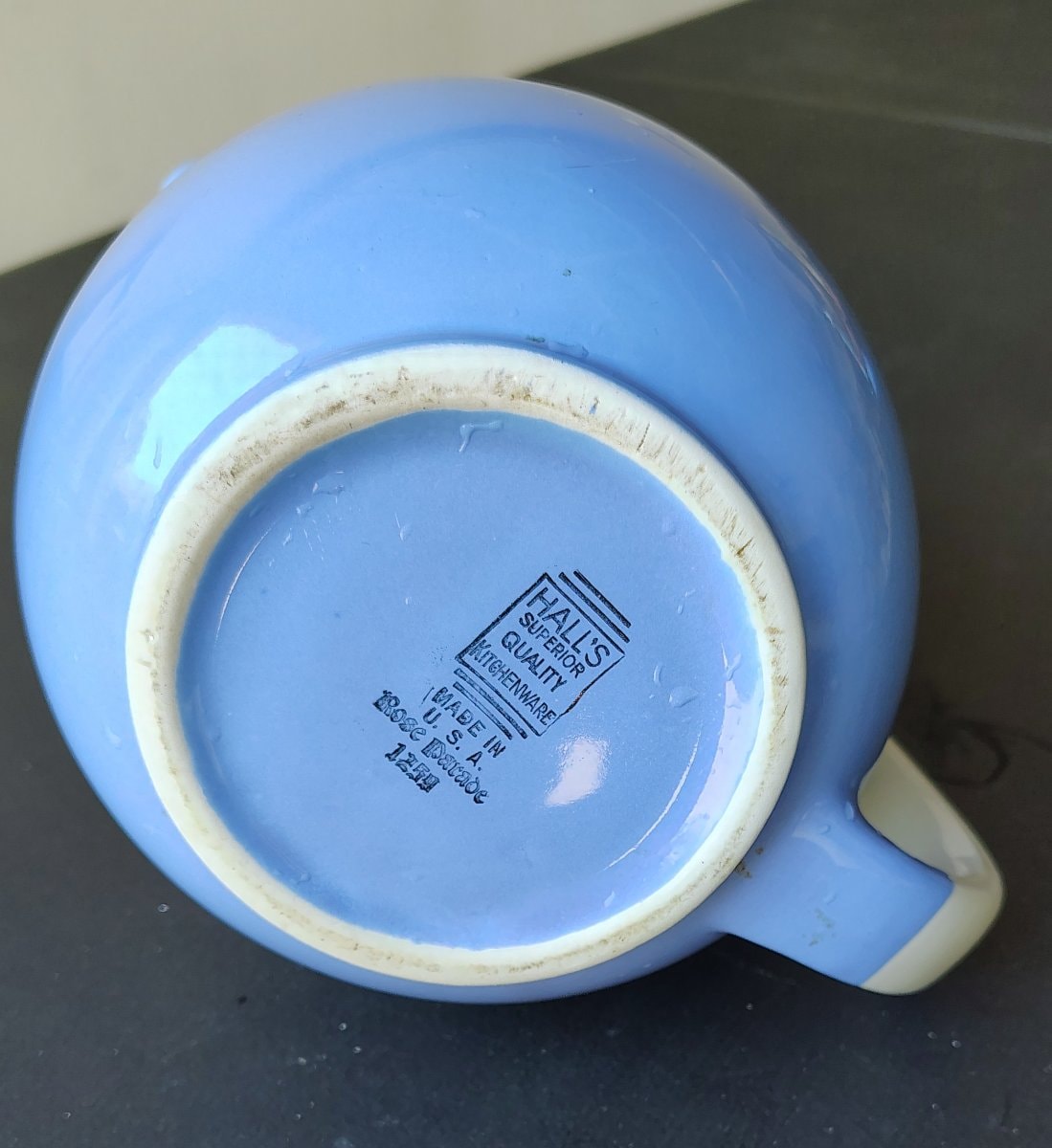 The glaze appears remarkably bright and glossy with no visible crazing, which is a testament to Hall's superior firing process. There is some light shelf wear on the unglazed foot ring and what appears to be a small amount of residue or minor wear on the handle.