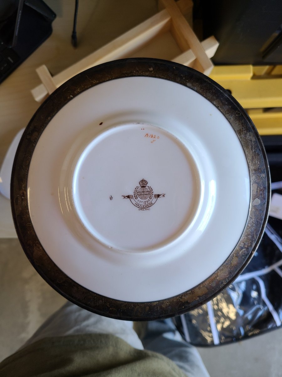 During the 1920s, high-end department stores and jewelers like Tiffany & Co. would often take imported English porcelain and commission silversmiths to add decorative metal rims, turning a standard tea service into a prestigious wedding gift.