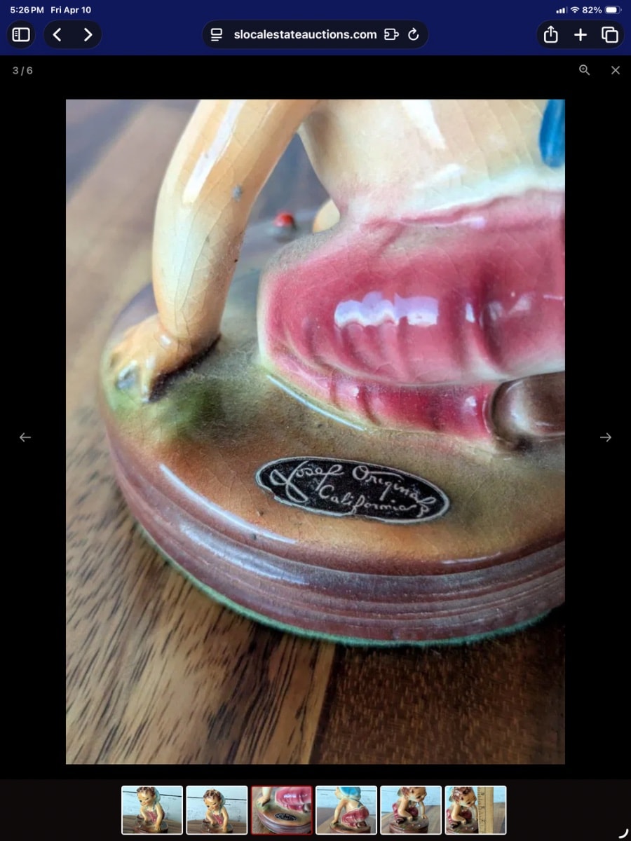 The figurine shows significant crazing throughout the glaze, which is typical for California pottery of this age and does not greatly detract from value. The original foil label is in excellent condition, which is a major value driver. No visible chips or repairs are present in the photos.