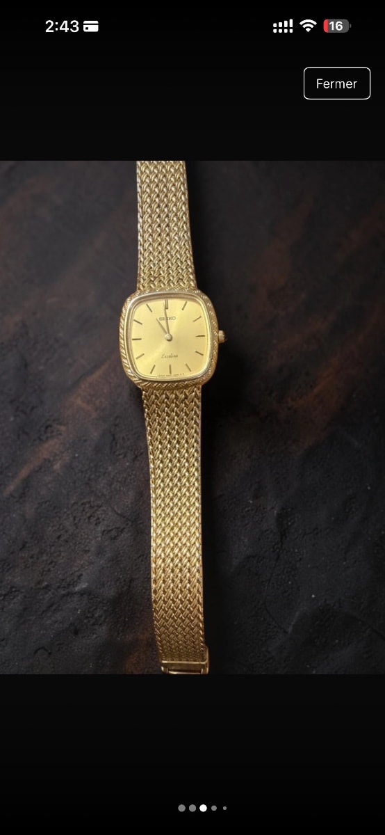 A refined ladies' dress watch from Seiko's high-end 'Exceline' line, featuring a gold-tone cushion case and an intricate integrated braided mesh bracelet.