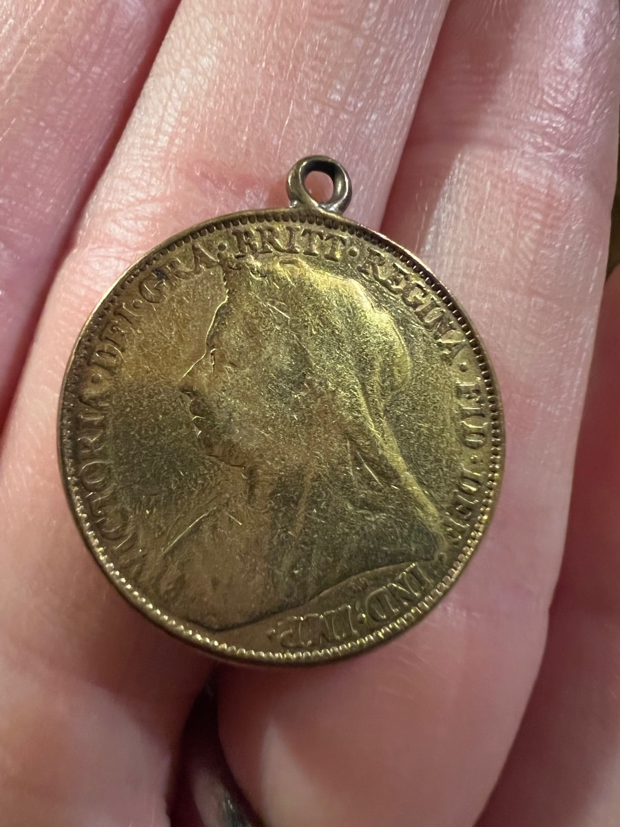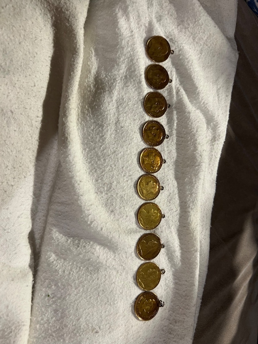 The coins show signs of being 'ex-jewelry,' specifically the small jump rings soldered to the edges. This modification constitutes permanent damage to a coin collector, but for a jewelry lover, it preserves the history of the piece. The gold itself shows expected wear from its time as a bracelet.
