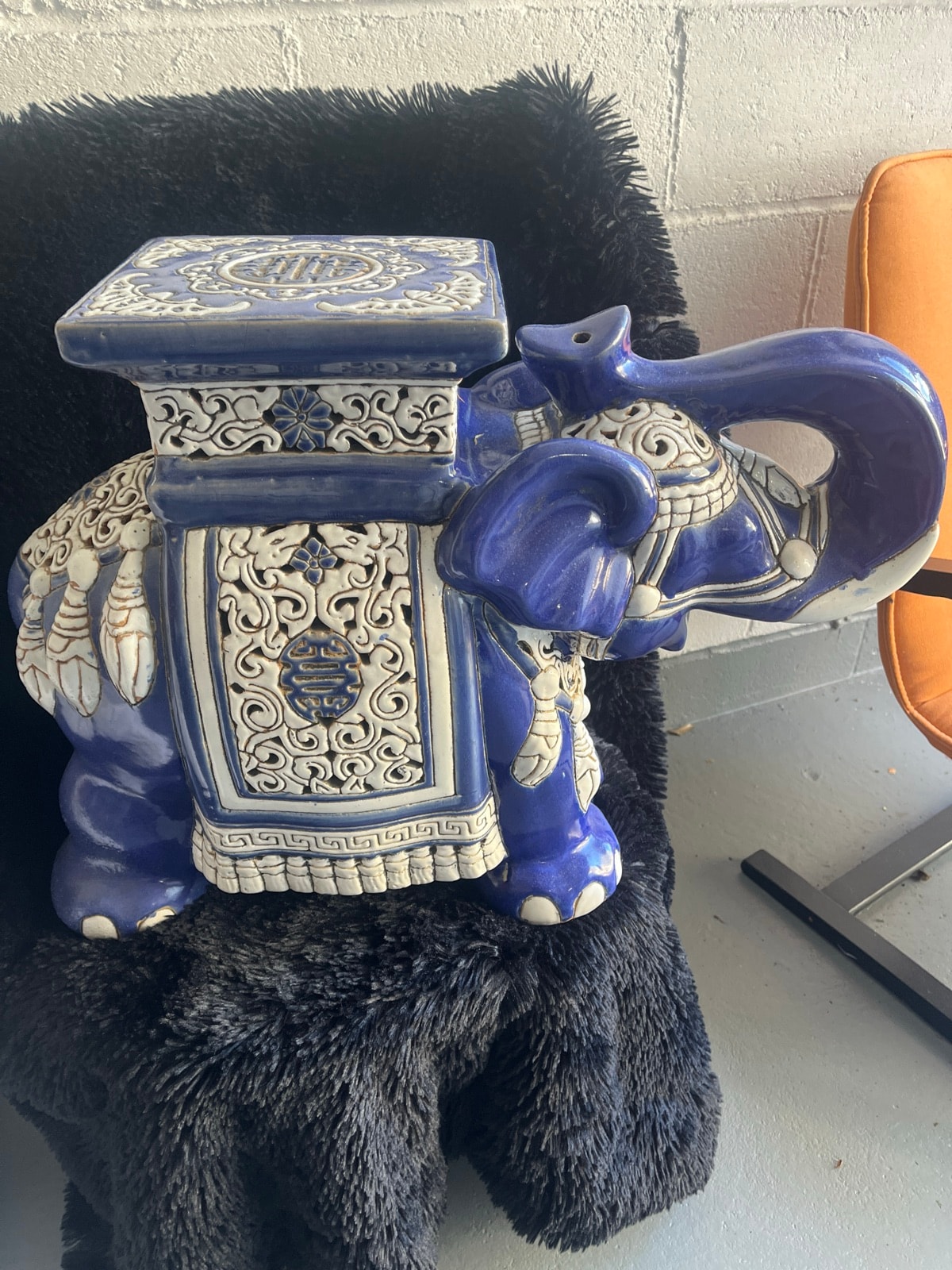 A striking cobalt blue and cream glazed ceramic garden stool modeled as a caparisoned elephant in the 'fahua' style. It features intricate openwork panels and the traditional 'Shou' symbol, representing longevity and good fortune.