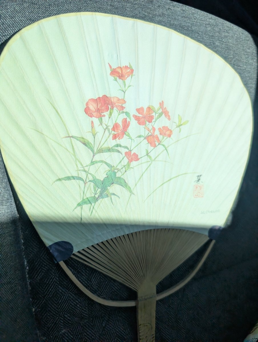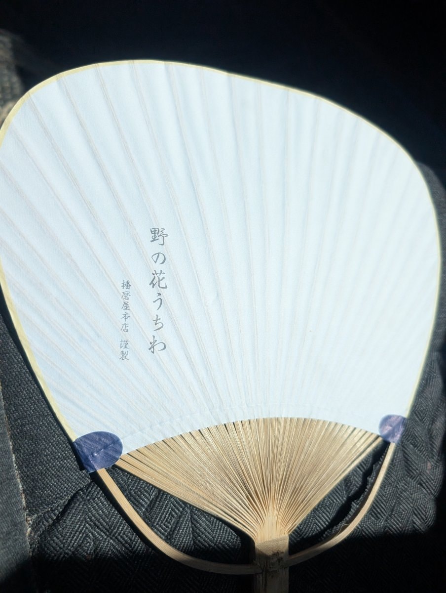 Centuries ago, these fans were symbols of status and ritual power before becoming the cooling companions of summer festivals. This specific fan comes from Harimaya, a name synonymous with traditional Japanese confectionery and hospitality. It was likely a seasonal gift, meant to bring a literal 'breath of fresh air' to a favored guest.