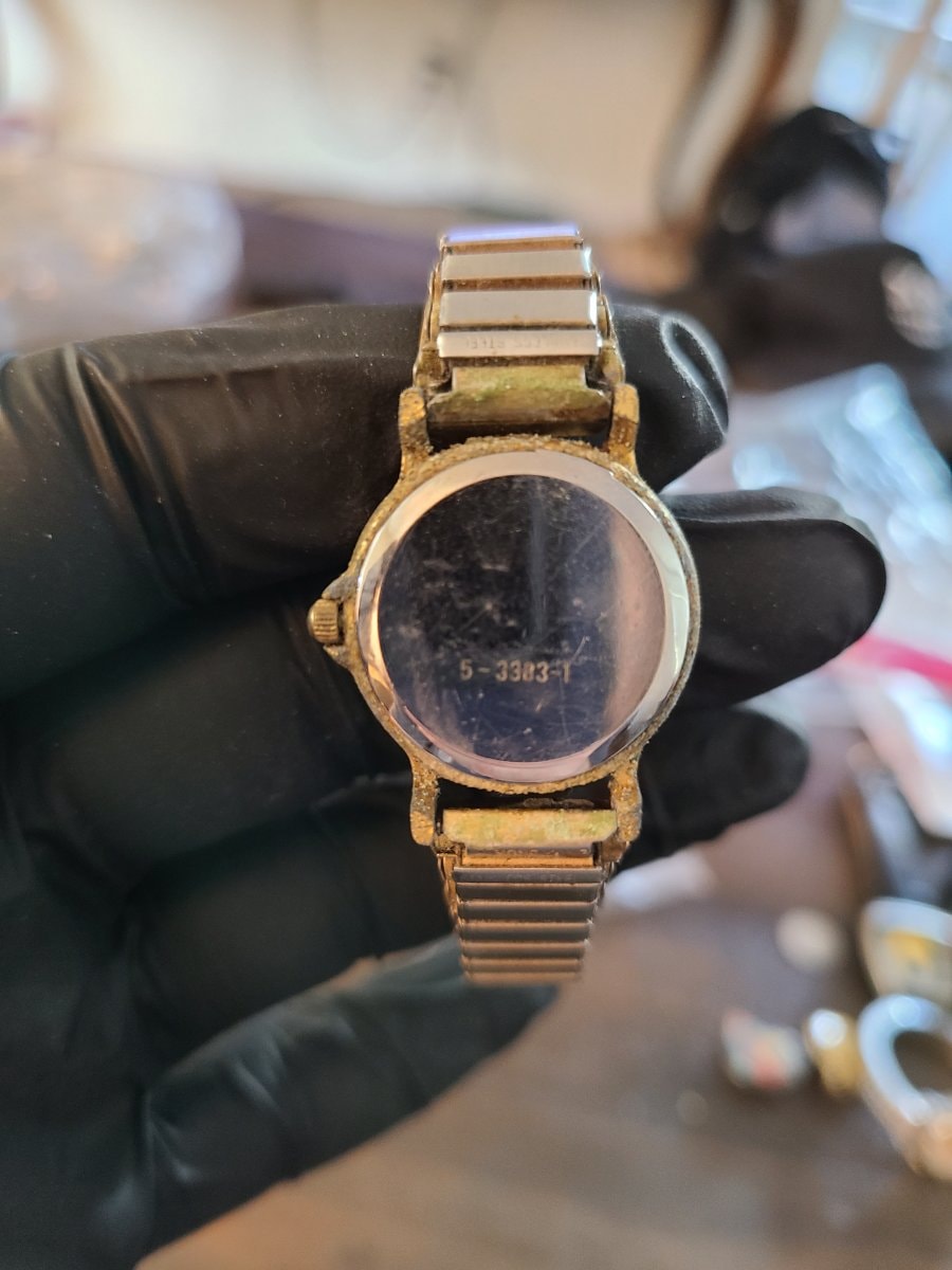 The watch shows significant signs of wear, including heavy oxidation (verdigris) on the lugs and case back, and thinning of the gold-tone plating. The movement is untested and would likely require a new battery and a thorough cleaning to be wearable. The heavy wear to the base metal reduces the value significantly.
