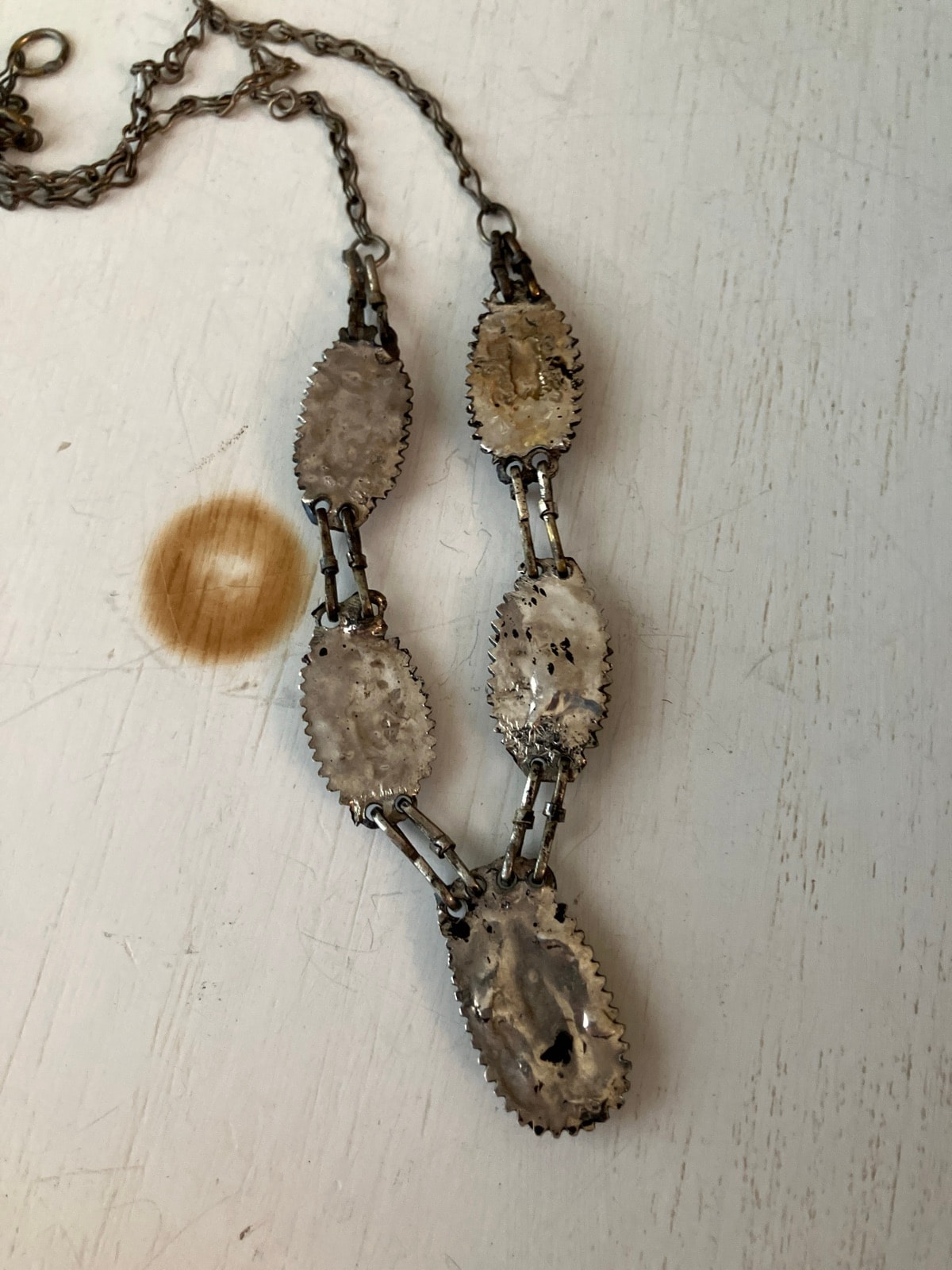 The necklace shows a heavy, dark patina and some oxidation on the reverse, which is typical for this type of alloy. The stones appear secure, though there is some minor surface wear consistent with age. The heavy tarnish actually highlights the filigree detail, though it could be lightly polished if a brighter look is desired.